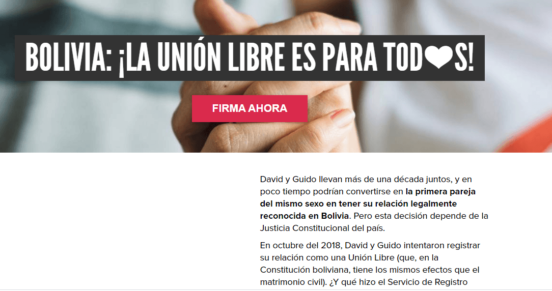 Osmar Arroyo/El AndaluzEl secretario de Relacionamiento Institucional del colectivo de Lesbianas, Gays, Bisexuales y Transexuales (LGBT), en Tarija, Joel Vela, señaló que Guido y David podrían convertirse en la primera pareja que legaliza su unión en Bolivia, tras una larga pelea en instancias judiciales.Se trata dos personas que desde el 2018 iniciaron una pelea judicial para poder legalizar su unión como pareja en el país.Vela, dijo que se siguió un procedimiento judicial en una primera instancia en donde se conminó al Servicio de Registro Cívico (Sereci) a que pueda garantizar la unión de las dos personas, pero esa instancia omitió la resolución emitida generando un sesgo jurídico y no cumplió con la resolución.El Sereci envió una consulta sobre el tema al Tribunal Constitucional Plurinacional (TCP) sobre el caso el caso en particular.El colectivo LGBT y otras plataformas iniciaron una campaña a través de la web para promover el falló constitucional, para que sea favorable a la legalización de la unión de dos personas del mismo sexo.Vela, señaló que en caso de que el falló sea favorable sería la primera pareja en Bolivia en legalizar su unión.Mencionó, que incluso hay influencer que apoyan la campaña iniciada para la legalización de la unión de esa pareja.Remarcó, que David y Guido sólo piden poder ejercer sus derechos civiles como bolivianos.“Es una primera pareja que realiza este procedimiento constitucional”, expresó, a tiempo de aclarar que en el país no es que no haya una protección jurídica, simplemente hay brechas incoherentes cuando se dice que Bolivia es un país que no discrimina, pero al mismo tiempo se prohíbe el derecho civil de que dos personas del mismo sexo puedan estar juntos.Señaló, que en otros países de Latinoamérica, ya se aprobaron normas para permitir las uniones libres o los acuerdos de vida en familia.Considera que el TCP debe dar una sana interpretación de la normativa legal sobre el caso, porque buscan ejercer un derecho, una pareja que ya se unió hace muchos años y generó un patrimonio pero buscan legalizarlo.Vela, dijo que también se debe tomar en cuenta los tratados internacionales sobre esta situación, fallos que ya se emitieron a nivel internacional.En las redes sociales se hace una dura campaña para elevar una petición al TCP para que se pronuncie de manera favorable.Se pide la firma digital de la petición en internet https://action.allout.org/es/a/unionlibre/ y se viraliza la petición en redes sociales, como Facebook, whatsapp y twitter.Joel Vela, recordó que el 2018 se hicieron llegar varias propuestas de proyectos de Ley a la Asamblea Legislativa Plurinacional de Bolivia (ALPB), que incluían el acuerdo de convivencia en familia y también otra contra los crímenes de odio, el colectivo solicito tomar en cuenta a la población trans en la Ley 348 de Lucha contra la violencia hacia las mujeres, pero no tuvieron una respuesta favorable.Mencionó, que el mayor problema que tienen es en el sistema administrativo, se tuviesen que generar normativas para garantizar esos derechos, ejercer un estado civil reconocido por el Estado. Navegación de entradasInstalan en la UAJMS un segundo laboratorio para Tarija que procesará pruebas de covid 19 Portada
