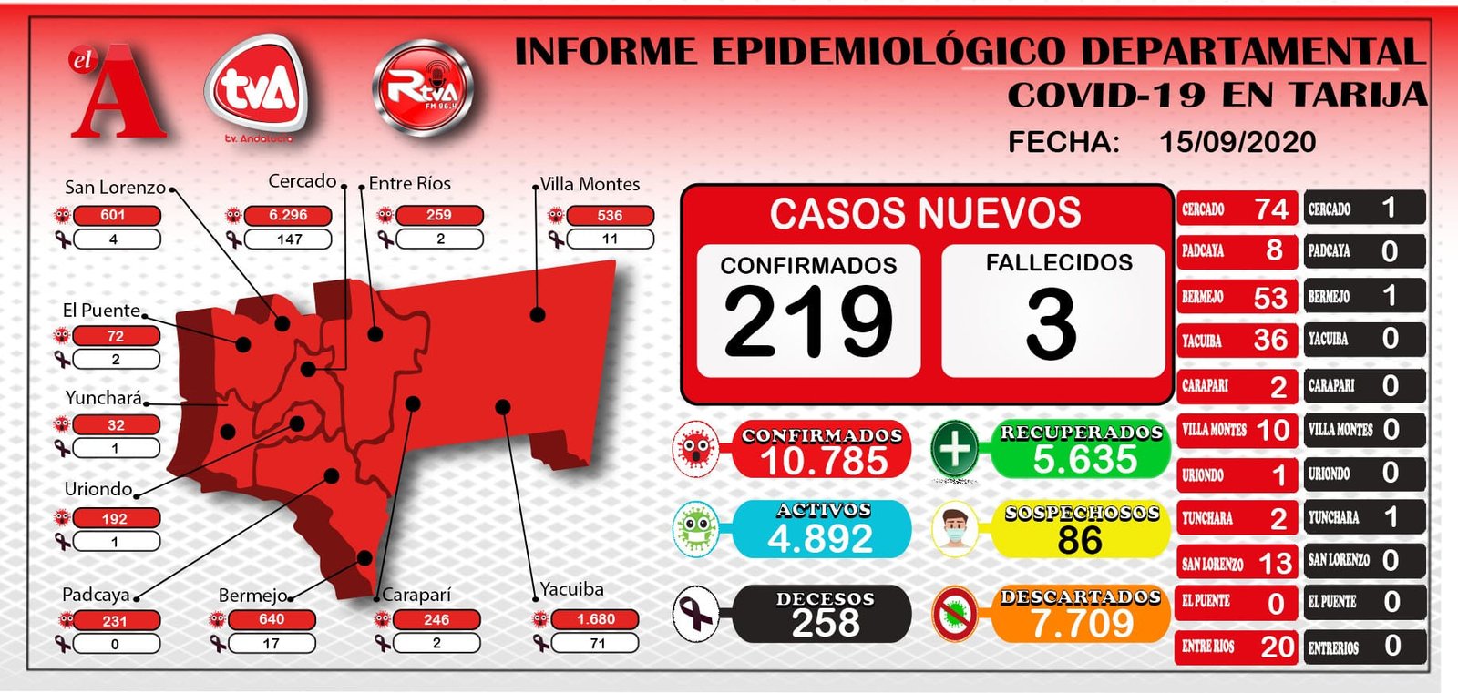 Tarija sumo 219 nuevos casos de coronavirus para este martes y el total a nivel departamental ya llegó a los 10.785 contagios. Según los datos del Sedes, Cercado fue el que más casos sumó, con 74. Le sigue Bermejo con 53, Yacuiba con 36, Entre Rios con 20, San Lorenzo con 13, Villamontes con 10, Padcaya con 8, Yunchara con 2 y Carapari con 2 y Uriondo con 1. Además, Tarija también sumó 3 decesos durante esta jornada: 1 que corresponden a Cercado, (1 paciente de sexo femenino de 58 años) 1 a Yunchara (1 paciente de sexo masculino de 73 años) y 1 a Bermejo (1 paciente de sexo masculino de 73 años). Así, llegó a las 258 víctimas fatales a causa de la enfermedad. Finalmente, Tarija también llegó a los 5.635 pacientes recuperados del Covid-19 a nivel departamental registrando hoy apenas 66. Ademas hay 4.892 activos, 86 sospechosos y 7.709 descartados. Navegación de entradasTransporte: Por falta de una terminal interprovincial no se reinician viajes Portada
