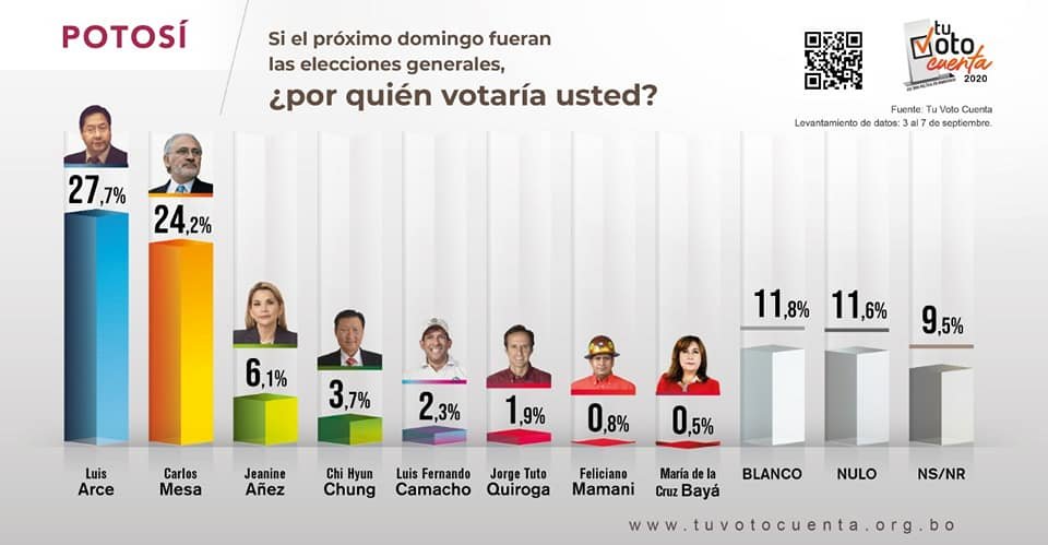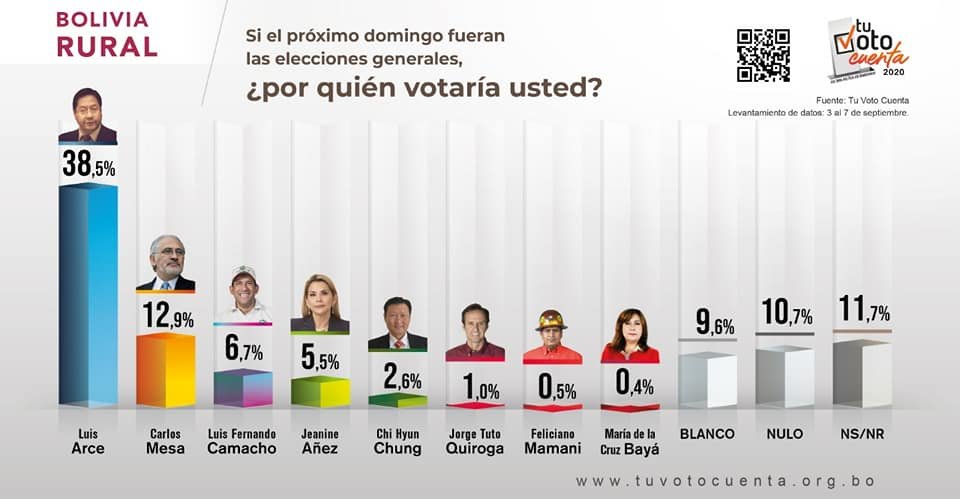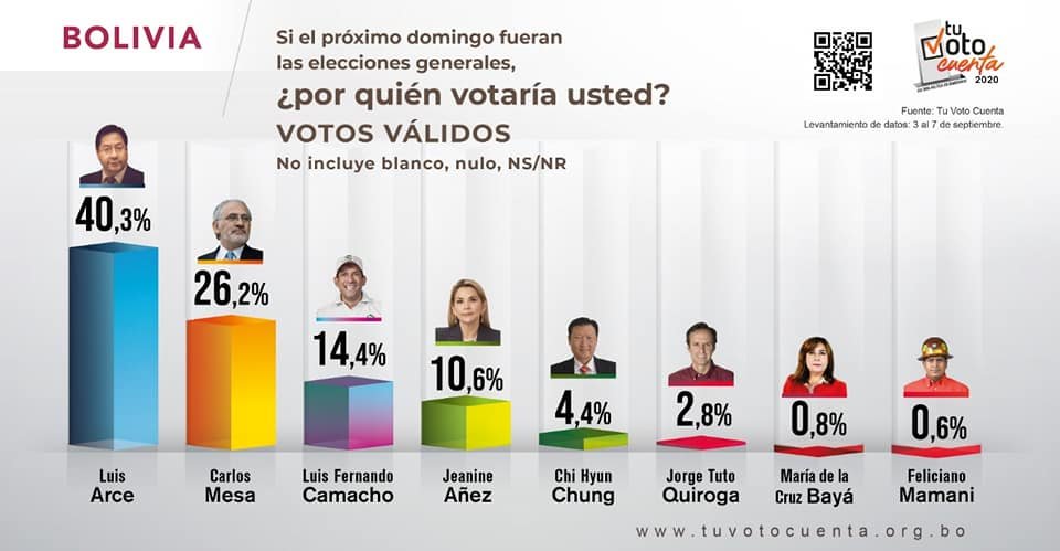Mientras que, a nivel nacional, el MAS, con Luis Arce, podría ganar en primera vuelta, puesto que el candidato del partido azul posee 40.3% de intención de voto, seguido por Carlos Mesa con 26.2%, esto significa que Arce posee los requisitos para gar en primera vuelta, porque sobrepasaría el 40%, además de que sacaría arriba de 10 puntos a su rival más próximo.