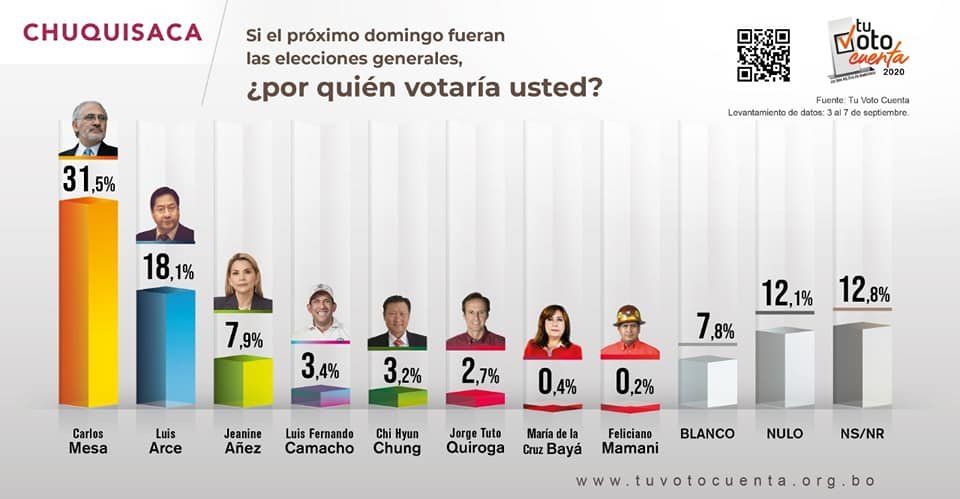 Carlos Mesa gana en Chuquisaca por una amplia mayoría, con una intención de voto del 31.5%, seguido por Luis Arce con el 18.1%.