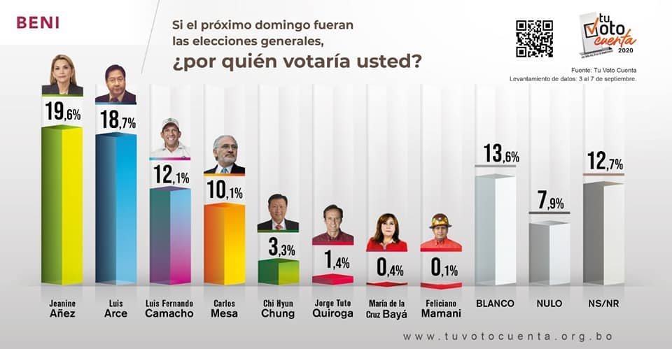 El único departamento que puesta por Añez es el Beni, donde posee 19.6% de intención de voto, seguida por Luis Arce con 18.7% y Camacho con una anda tímido 12.1%.