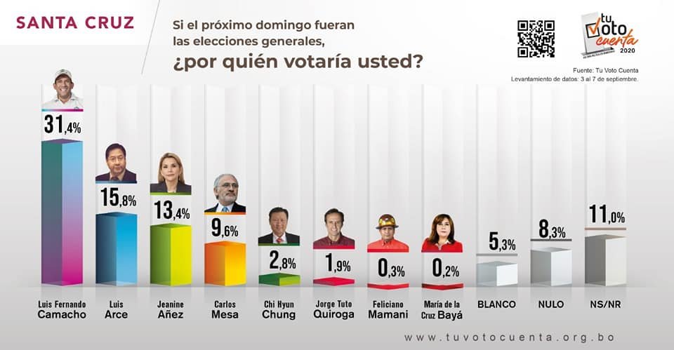 Sorprende que Luis Fernando Camacho a nivel nacional ocupe un tercer lugar, con 14.4% de intención de voto, mientras que Jeanine Añez, se va a cuarto lugar con un 10.6%. Es notorio que los casos de corrupción, y la pésima gestión de Añez le estén pasando factura.