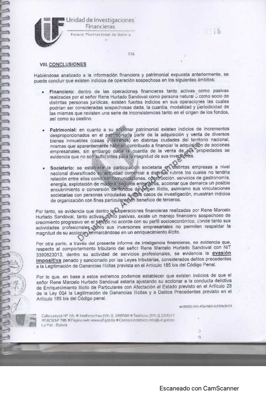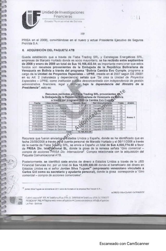 Una vez recibidos esos recursos, que le pertenecían al Estado boliviano, fueron traspasados a cuentas privadas (ver documento de la UIF adjunto). Luego se enviaron 4,5 millones de dólares a España a cuentas del grupo PRISA, mediante la empresa Flaba Trading, que pertenece a Marcelo Hurtado, para la adquisición de La Razón-Extra, dice el informe de la UIF.