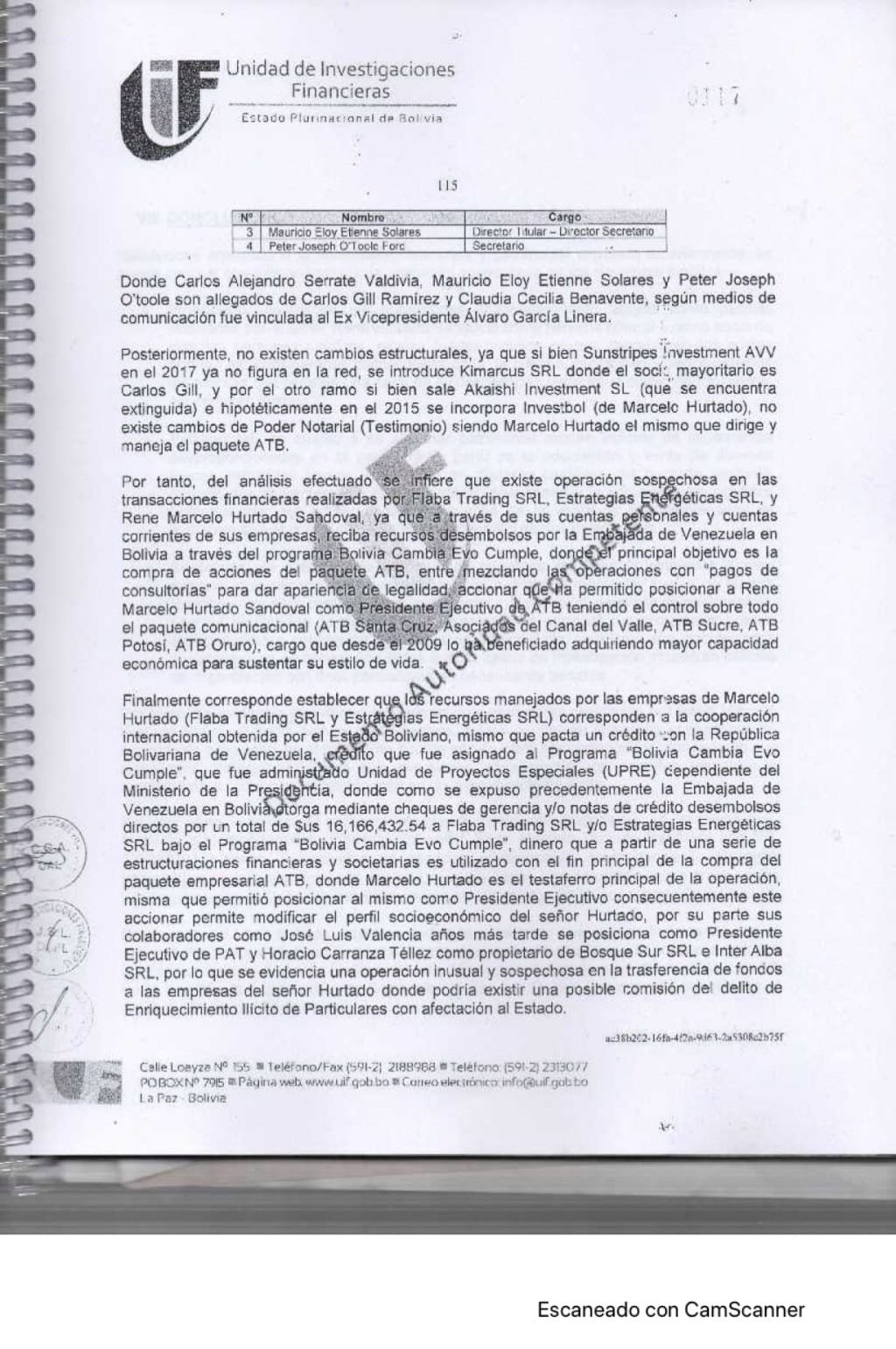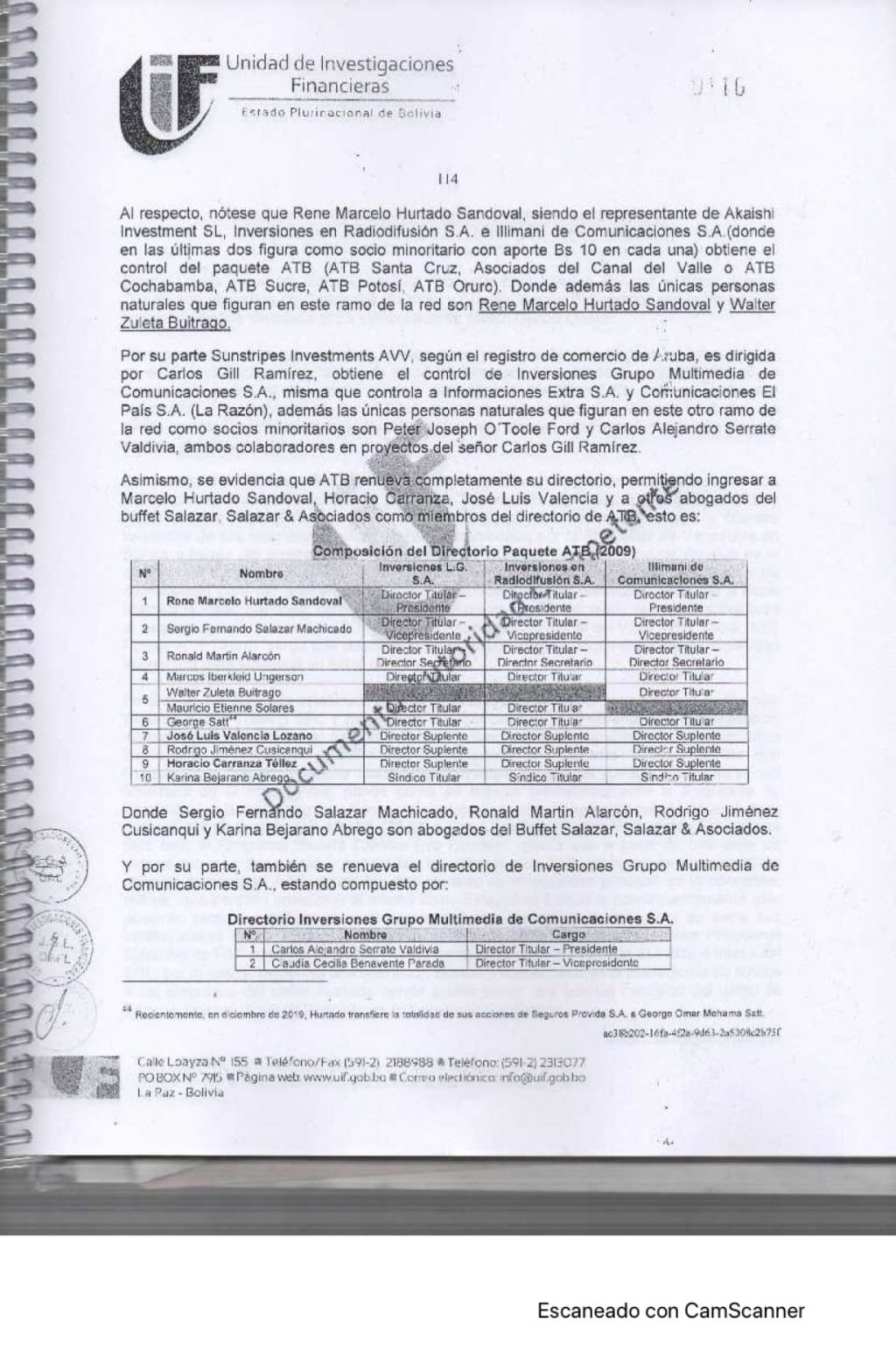 Posteriormente, añade el informe, las acciones de La Razón-Extra terminaron en manos de Carlos Gill, y las de ATB en las de Marcelo Hurtado; este último fue gerente general de esa empresa durante una década hasta que cayó detenido en enero pasado acusado de legitimación de ganancias ilícitas y otros delitos. Hurtado luego fue también propietario de PAT, según datos de la Fiscalía que sigue la investigación, canal que el gobierno anterior adquirió mediante extorsión según denunció su dueño anterior, Abdallah Daher.