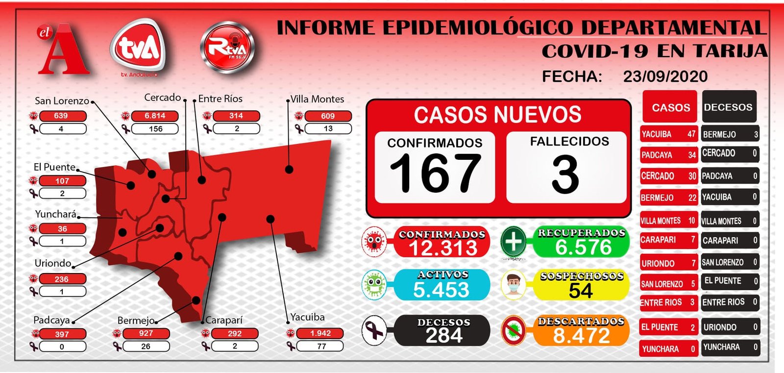REDACCION CENTRAL// EL ANDALUZEl Servicio Departamental de Tarija (Sedes), reporto 167 nuevos casos positivos de coronavirus en esta jornada, y la cifra a nivel departamental contabiliza los 12.313 contagios.Según los datos del Sedes, Yacuiba fue el que más casos sumó, con 47. Le sigue Padcaya con 34, Cercado con 30, Bermejo con 22, Villa Montes con 10, Carapari con 7, Uriondo con 7, San Lorenzo con 5, Entre Ríos 3, El Puente 2 y Yunchara no registro hoy.Además, Tarija también sumó 3 decesos durante esta jornada: todas corresponden a Bermejo, (2 pacientes de sexo masculino de 64 y 84 años y 1 de sexo femenino de 66 años). Así, llegó a las 284 víctimas fatales a causa de la enfermedad.En el acumulado estos son los datos del Sedes, Cercado en primer lugar con 6.814. Le sigue Yacuiba con 1.942, bermejo con 927, San Lorenzo con 639, Villa Montes con 609, Padcaya con 397, Entre Rios con 314, Carapari con 292, Uriondo con 236, El Puente con 107 y Yunchara con 36 contagios.Los decesos en el acumulativo hasta ahora, Cercado lamenta más perdidas con 156. Le sigue Yacuiba con 77, Bermejo con 26, Villa Montes con 13, San Lorenzo con 4, Carapari con 2, Entre Ríos con 2, El Puente con 2, Yunchara 1, Uriondo 1 y Padcaya 0.Finalmente, Tarija también llegó a los 6.576 pacientes recuperados del Covid-19 a nivel departamental, hoy se recuperaron 97. Además, hay 5.453 activos, 54 sospechosos y 8.472 descartados. Navegación de entradasATT ADVIERTE CON SANCIONES AL TRANSPORTE SI HACEN EL EMBARQUE DE PASAJEROS EN LA PARADA DEL NORTE Portada