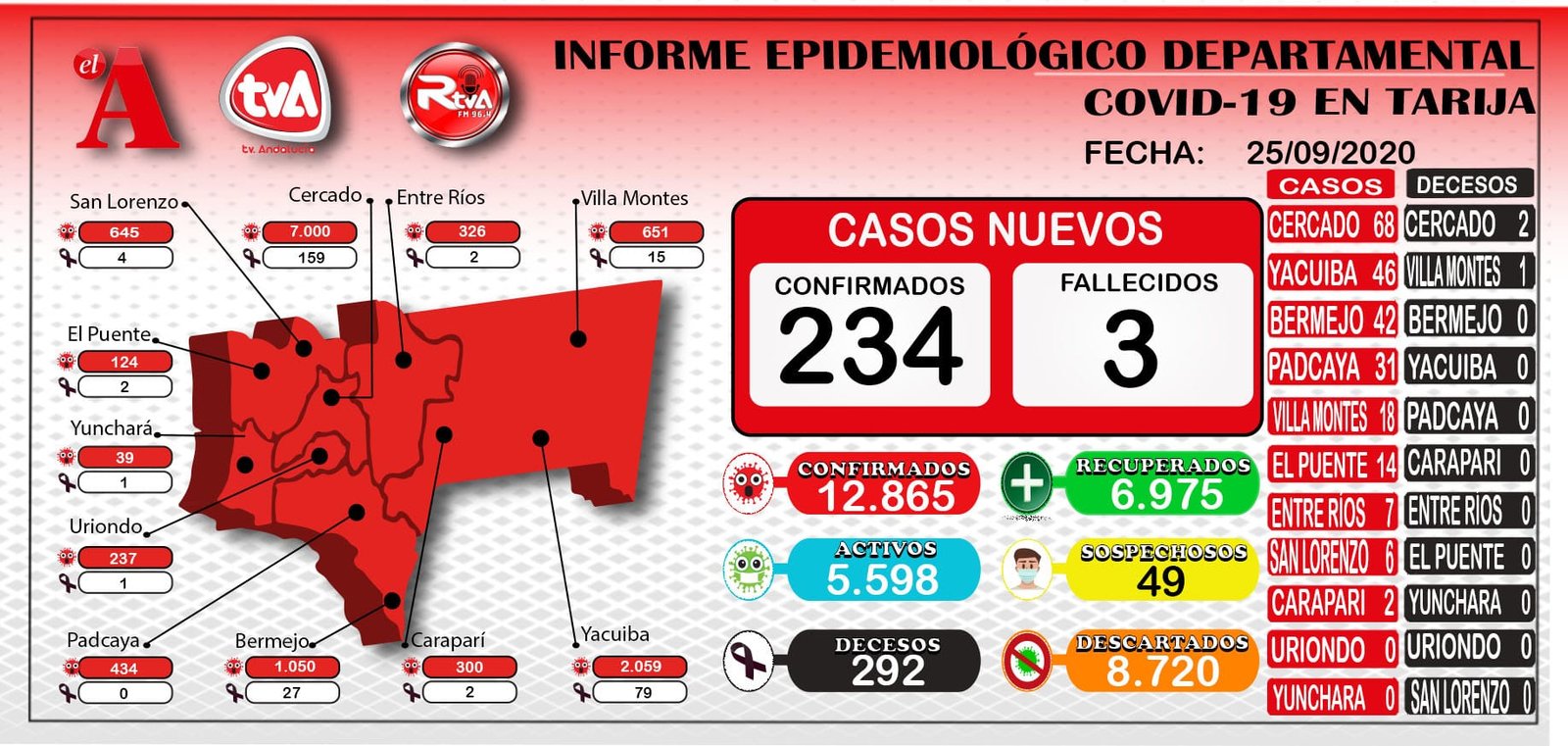 REDACCIÇON CENTRAL// EL ANDALUZEl Servicio Departamental de Tarija (Sedes), reporto 3234 nuevos casos positivos de coronavirus en esta jornada y lamentablemente la cifra a nivel departamental contabiliza los 12.865 contagios.Según los datos del Sedes, Cercado fue el que más casos sumó, con 68. Le sigue Yacuiba con 46, Bermejo con 42, Padcaya con 31, Villa Montes con 18, El Puente con 14, Entre Ríos con 7, San Lorenzo con 6, Carapari 2, Uriondo y Padcaya no registraron hoy.Además, Tarija también sumó 3 decesos en esta jornada: 2 que corresponden a Cercado, (2 pacientes de sexo masculino de 29 y 63 años), 1 a Villa Montes (1 paciente de sexo masculino de 78 años). Así, llegó a las 292 víctimas fatales a causa de la enfermedad.Finalmente, Tarija también llegó a los 6.975 pacientes recuperados del Covid-19 a nivel departamental, hoy se recuperaron 238. Además, hay 5.598 activos, 49 sospechosos y 8.720 descartados. Navegación de entradasCOED anuncia medidas conjuntas con fuerzas del orden para evitar aglomeraciones Filas en surtidores de Tarija para comprar diésel