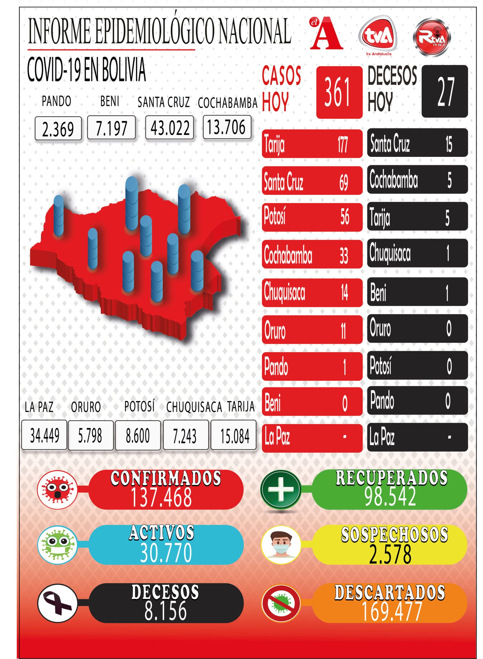 Las cifras acumuladas por departamentos son: Santa Cruz 43.022, La Paz 34.449, Tarija 15.084, Cochabamba 13.706, Potosí 8.600, Chuquisaca 7.243, Beni 7.197, Oruro 5.798, Pando 2.369.