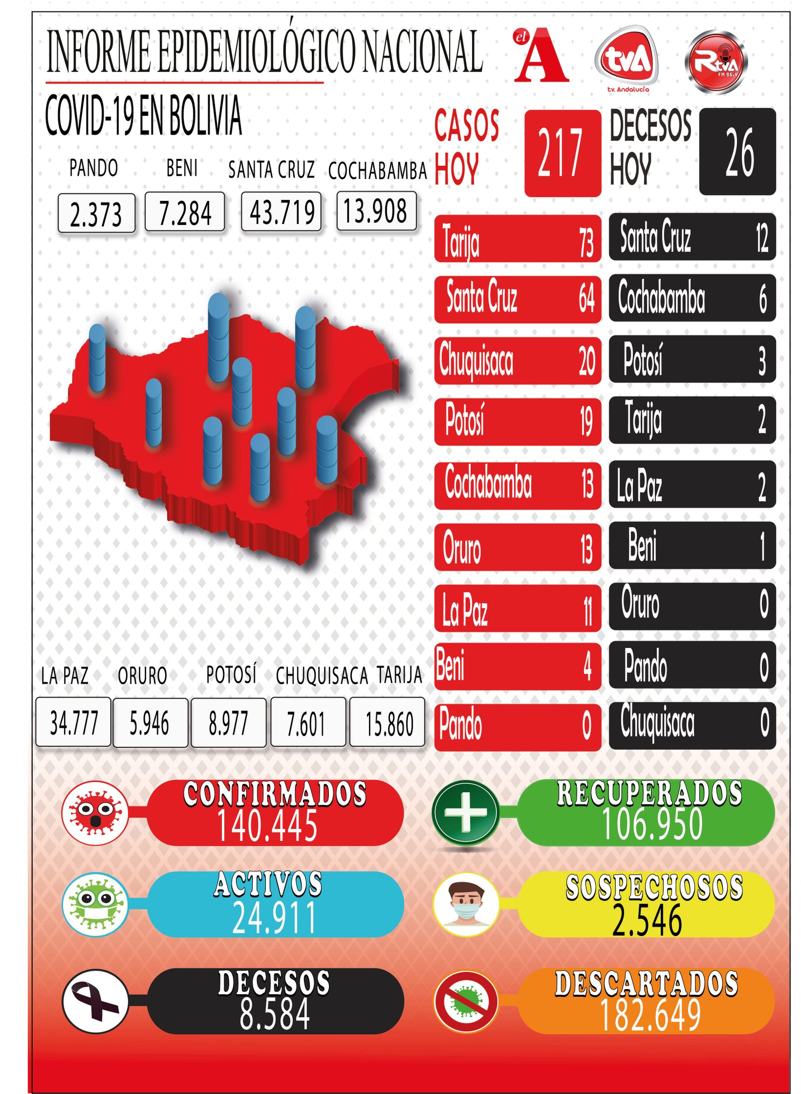 Según el reporte del Ministerio de Salud, Tarija fue el departamento que más casos nuevos de coronavirus sumó esta jornada, con 73. Le siguieron Santa Cruz con 64, Chuquisaca con 20, Potosí con 19, Oruro con 13, Cochabamba con 13, La Paz con 11 y Beni con 4.REDACCIÓN CENTRAL// EL ANDALUZBolivia contabilizó un total de 140.445 contagios de coronavirus confirmados. En la presente jornada se sumaron 217 nuevos infectados en ocho departamentos del país, según el reporte del Ministerio de Salud.Los nuevos infectados se registraron en Tarija, con 73 nuevos casos; Santa Cruz (64), Chuquisaca (20), Potosí (19), Oruro (13), Cochabamba (13), La Paz (11), y Beni (4).El reporte detalla que hubo 26 decesos por Covid-19. De los cuales, 12 fueron en Santa Cruz, seis en Cochabamba, tres en Potosí, dos en La Paz, dos en Tarija y uno en Beni. En todo el país, el número total de víctimas mortales por la pandemia, es de 8.584 desde el primer deceso.En cifras globales, el departamento de Santa Cruz suma hasta ahora 43.719 personas contagiadas. Luego está La Paz con 34.777; Tarija con 15.860, Cochabamba con 13.908; Potosí 8.977, Chuquisaca con 7.601; Beni con 7.284; Oruro 5.946; y Pando reporta en total, 2.373 confirmados.Entre los pacientes contagiados, 106.950 se recuperaron y recibieron su alta médica por lo que hay 24.911 casos activos en el país. El reporte oficial epidemiológico contabilizó también 182.649 pruebas que fueron descartadas en laboratorio y se espera el resultado de otros 2.246 casos sospechosos.Ríos manifestó que la situación de la “incubación silenciosa” aún se mantiene en el departamento y preocupa que, en los últimos días, se reportaron más de 60 casos diarios a diferencia de la anterior semana, cuando no pasaban de 50 casos. Explicó que, en primera instancia, se debería al aumento del número de muestras procesadas.Ríos explicó que no se puede precisar si la cantidad de camas sea suficiente, lo mismo que los respiradores, «en un rebrote que puede ser de grandes magnitudes”, alertó. Navegación de entradasBolivia lamenta hoy 191 nuevos contagios y 32 fallecidos por Covid-19 El “viejo” del bullado caso Terrorismo es encontrado con dos paquetes de droga