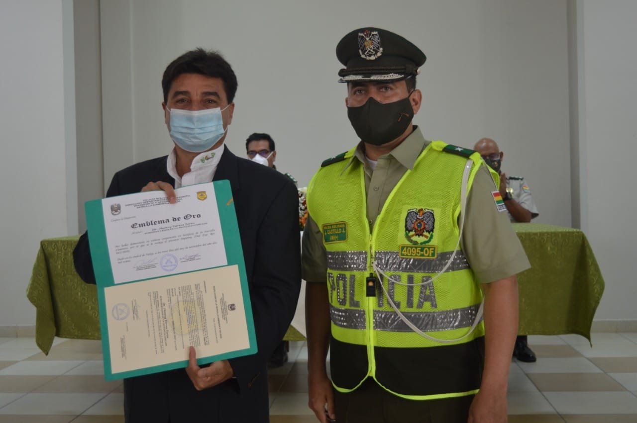 Redacción CentralAyer, al recordarse los 25 años de creación de la Patrulla Caminera, en Tarija, su comandante, My. Julio Castillo Justiniano, distinguió al subgobernador de Cercado, Johnny Torres Terzo, con el emblema de oro, en mérito al apoyo y trabajo de coordinación efectuado en favor de esta unidad de la policía boliviana.La distinción, es la más alta condecoración que la institución del verde olivo, entrega a diversas personalidades, como fruto del fortalecimiento impulsado en beneficio de la policía.“Estoy convencido que el acto más sublime de una persona, es cuando dedicas tu vida al servicio de los demás, los más débiles y los más necesitados”, dijo Torres, al momento de efectuar el brindis por los 25 años de vida de la patrulla caminera.Torres destacó los avances que se dieron al interior de la policía en general, sin embargo también reconoció algunas limitantes que enfrenta la entidad en el cumplimiento de sus diversas tareas.Como autoridad, comprometió mayor apoyo a la familia policial, dejando entrever el avance de una propuesta para la construcción de viviendas en el marco de un distrito policial, en el que no solo se dote de una infraestructura para el hogar de los policías en la ciudad, sino también para aquellos que en el cumplimiento de su deber, arriban temporalmente a Tarija, y no tienen donde vivir, aliviando su economía familiar.“Desde donde estemos, dentro de nuestra carrera política, vamos a brindar el apoyo necesario a la policía, principalmente por el aprecio que le tenemos y porque de esa manera contribuiremos a garantizar una mayor seguridad ciudadana, para mejorar la calidad de vida”, finalizó Torres. Navegación de entradasTarija reporto 15 nuevos casos, alcanzo la cifra de 16.469, 32 recuperados y 2 decesos Oliva entregar el Centro de acogimiento temporal para personas con Cáncer