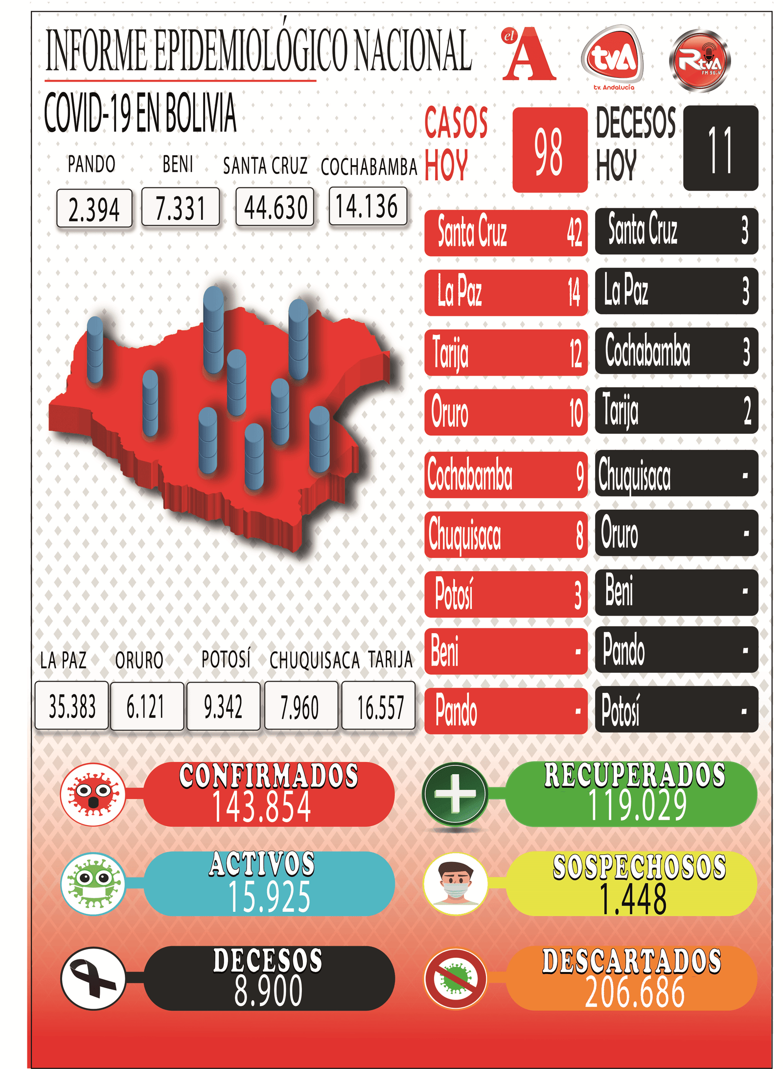 Según el reporte del Ministerio de Salud, Santa Cruz con el mayor número de contagios de coronavirus con 44.630 casos, le sigue La Paz con 35.383, Tarija 16.557, Cochabamba 14.136, Potosí 9.342, Chuquisaca 7.960, Beni 7.331, Oruro 6.121 y Pando 2.394.LA PAZ// AGENCIASEl Ministerio de Salud reportó este viernes 98 contagios nuevos de COVID-19 y el total acumulado subió a 143.854 casos, de los que 15.925 son activos.De acuerdo con el reporte epidemiológico de la fecha, el departamento de Santa Cruz sumó 42 casos positivos, La Paz 14, Tarija 12, Oruro 10, Cochabamba nueve, Chuquisaca ocho y Potosí tres.Las cifras acumuladas por departamento mantienen a Santa Cruz con el mayor número de contagios de coronavirus con 44.630 casos, le sigue La Paz con 35.383, Tarija 16.557, Cochabamba 14.136, Potosí 9.342, Chuquisaca 7.960, Beni 7.331, Oruro 6.121 y Pando 2.394.El Ministerio de Salud también totalizó 119.029 pacientes recuperados, 206.686 pruebas negativas y 1.448 casos sospechosos por el momento.El reporte oficial incluye 11 fallecidos en las últimas horas. En Cochabamba tres, La Paz tres, Santa Cruz tres y Tarija dos lo que hace un total de 8.900 decesos desde el brote de COVID-19 en el país. Navegación de entradasLa Paz tiene más del 30% de casos positivos por Covid-19 del país, con 62 registros El MAS quiere ganar en siete gobernaciones y 300 alcaldías en las elecciones subnacionales