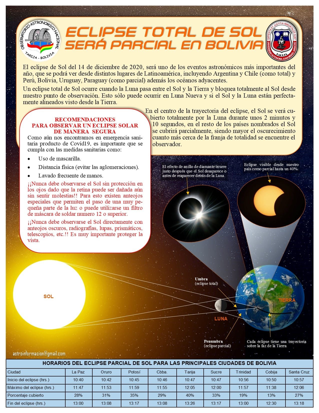 (Roberto A. Barriga/El Andaluz)El técnico astrónomo, Pavel Balderas, informó a EL Andaluz que se debe tener precaución al observar el eclipse solar del próximo lunes 14 de diciembre, en nuestra zona será parcial, los eclipses solares son peligrosos al observarlos, advierte no utilizar rollos de película negativos, radiografías, sólo está permitido filtros autorizados y lentes de soldar explicó.El eclipse de Sol del 14 de diciembre de 2020, será uno de los eventos astronómicos más importantes del año, que se podrá ver desde distintos lugares de Latinoamérica, incluyendo Argentina, Perú, Bolivia, Chile, Uruguay y Paraguay, y los océanos adyacentes.También, se podrá ver en ciertas regiones de Oceanía, incluyendo las islas de la Polinesia Fran-cesa y las islas Pitcairn; en la zona occidental de la Antártida e islas aledañas; en las islas del Atlántico Santa Elena, Ascensión y Tristán de Acuña; y, al atardecer, en unos pocos países de África del sur: Namibia, y sudeste de Sudáfrica y Angola.En esta oportunidad, la zona de máximo eclipse pasará por el norte de la Patagonia Argentina, y en las zonas de Biobio, Araucania y los Ríos en Chile donde la Luna ocultará totalmente al Sol, lo que hará que se oscurezca el ambiente, haciéndose “de noche” en pleno día, siendo mayor el oscurecimiento cuanto más cerca de la franja de totalidad se encuentre el observador. En el centro de dicha zona, el Sol se verá cubierto totalmente por la Luna durante unos 2 minutos y 10 segundos, en el resto de los países nombrados el Sol se cubrirá parcialmente, siendo mayor el oscurecimiento cuanto más cerca de la franja de totalidad se encuentre el observador.Un eclipse total de Sol ocurre cuando la Luna pasa entre el Sol y la Tierra y bloquea totalmente al Sol desde nuestro punto de observación. Esto sólo puede ocurrir en Luna Nueva y si el Sol y la Luna están perfectamente alineados visto desde la Tierra.Los eclipses solares totales son uno de los eventos astronómicos más increíbles de la naturaleza. Este eclipse total ocurrirá en una estrecha franja de unos 110 km de ancho. La rotación de la Tierra se encarga de que esta zona se vaya desplazando por la superficie de la Tierra siempre de oeste a este, formando una banda de totalidad. A ambos lados de esta banda y en una zona de miles de kilómetros de ancho, los observadores tendrán un eclipse parcial de Sol.Dado que para una región determinada un eclipse total de Sol resulta ser un evento astronómico extremadamente poco frecuente, la observación del fenómeno tendrá para las zonas de totalidad de la Argentina y Chile un alto valor científico, cultural y educativo, además del impacto en el sector turístico.RECOMENDACIONES PARA OBSERVAR UN ECLIPSE SOLAR EN FORMA SEGURAComo aún nos encontramos en emergencia sanitaria producto de Covid 19, es importante que se cumpla con las medidas sanitarias como:Uso de mascarilla.Distancia física (evita las aglomeraciones).Lavado frecuente de manos.Nunca debe observarse el Sol sin protección en los ojos dado que la retina puede ser dañada aún sin sentir molestias. Para esto existen anteojos especiales que permiten el paso de una muy pequeña parte de la luz o puede utilizarse un filtro de más-cara de soldar numero 12 o superior. Nunca debe observarse el Sol directamente con anteojos oscuros, radiografías, lupas, prismáticos, telescopios, etc. Es muy importante proteger la vista. No obstante, existen formas de apreciar un eclipse en forma indirecta, sin comprometer la vista del observador:Cámara oscura: la forma más sencilla y común de observar un eclipse solar es mediante la proyección a través de un agujero pequeño. Para ello se debe conseguir un tubo largo de cartón (como los usados para enrollar las telas) y colocarle en un extremo una cartulina negra que impida el paso de la luz del Sol. Luego se realiza una abertura pequeña que deje pasar la luz, de forma tal que se proyecte la imagen del Sol en una hoja de papel colocada en el otro extremo del tu-bo. Conviene hacer del lado de atrás, en un lateral del tubo, una abertura que permita quedar de espaldas al Sol en todo momento, manteniendo la línea de visión hacia el interior de la pantalla de proyección.Proyección con telescopio o binoculares: es una de las mejores técnicas para observar un eclipse. Se hace pasar la luz del Sol a través del instrumento (diafragmando la entrada de luz para disminuir su ingreso) y se proyecta sobre una superficie lisa donde incluso se pueden llegar a observar algunos detalles de la superficie solar. Es recomendable utilizar lentes de bajo aumento ya que producen imágenes más grandes y generan menos calor, protegiendo el instrumento. Nunca ver el Sol directamente a través de ningún instrumento óptico ya que puede producir quemaduras graves en la retina.El eclipse también puede ser observado si se dispone de un filtro solar adecuado, de calidad comprobada, los cuales se diseñan para utilizarlos como anteojos o para colocarlos delante del telescopio:Anteojos para eclipses: utilizan un filtro a base de un polímero negro especialmente diseñado, lo que permite utilizarlos para observar el eclipse cómodamente. Pese a esto, es conveniente no mantener la vista fija en el Sol durante mucho tiempo seguido.Filtros para telescopios: deben cubrir la totalidad de la entrada de luz, colocándose delante del instrumento. Se adquieren en los comercios dedicados a la venta de instrumental astronómico. No deben usarse filtros que se colocan en el ocular (donde se ubica el ojo), ya que pueden romperse debido a la alta temperatura provocada por la concentración de los rayos solares. Navegación de entradasUAJMS destaca elecciones transparentes en Tarija Fiscalía y Aduana Nacional firmes contra el contrabando