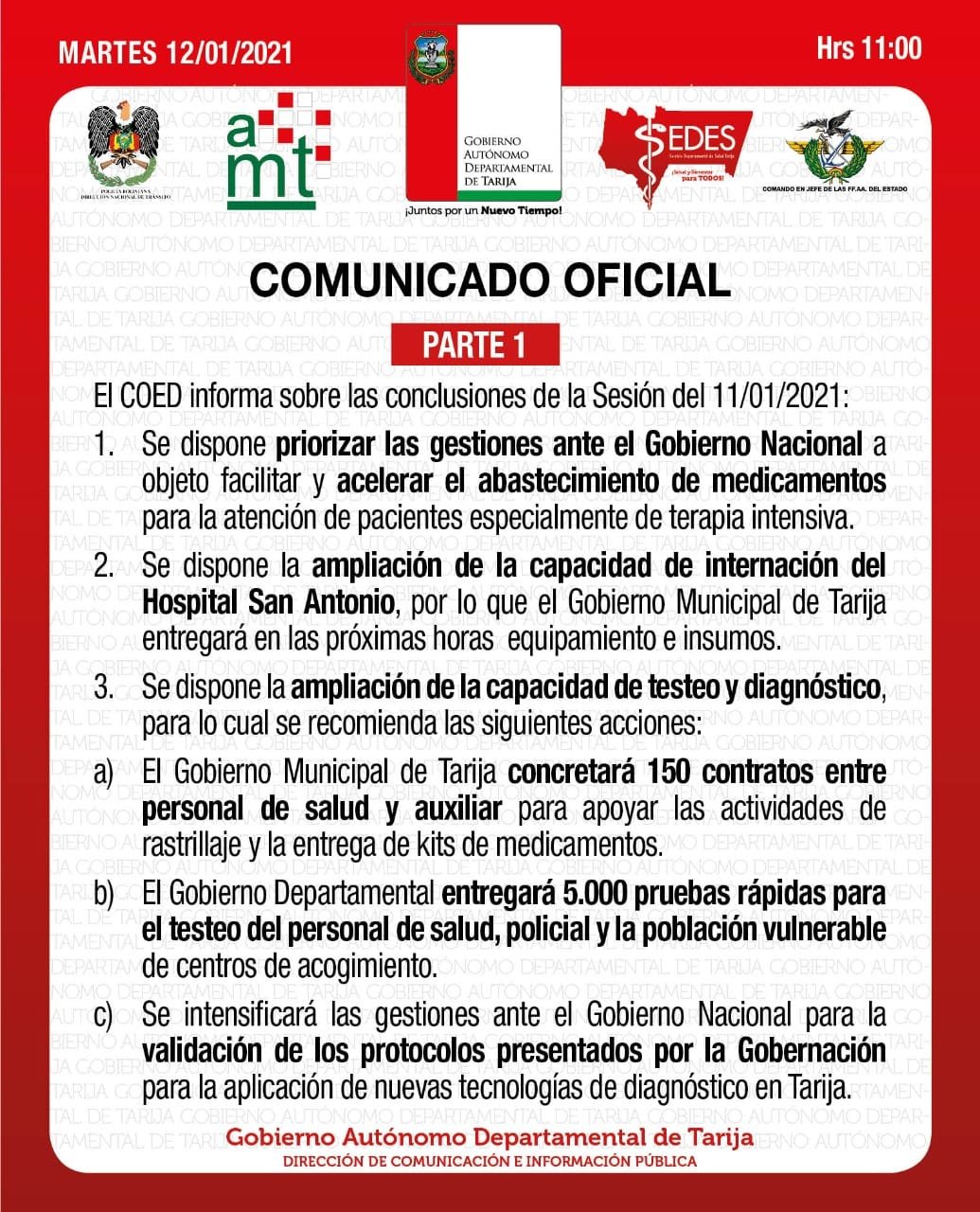 En conferencia de prensa, el gobernador de Tarija, Adrián Oliva, acompañado por el presidente del COED, Adel Vergara, informó que se ha dispuesto priorizar las gestiones ante el Gobierno Nacional a objeto facilitar y acelerar el abastecimiento de medicamentos para la atención de pacientes especialmente de terapia intensiva.