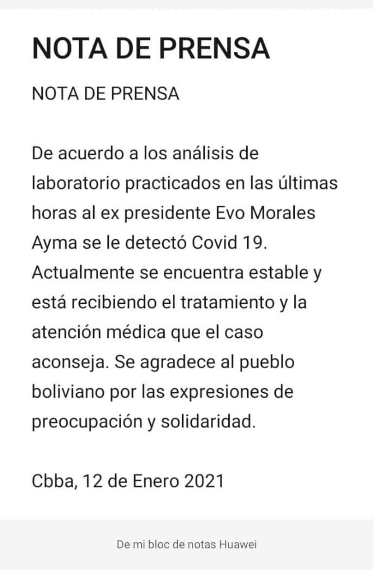 COCHABAMBA// PAGINA SIETEEl exmandatario Evo Morales dio positivo al coronavirus y se encuentra estable, según un reporte de la radio Kawsachun Coca de propiedad de la federación de productores de coca del trópico de Cochabamba liderado por Morales.La emisora oficial de los cocaleros sacó un comunicado ayer por la noche en el que ratifica que el expresidente dio positivo. “De acuerdo a los análisis de laboratorio practicado al expresidente Evo Morales Ayma se le detectó Covid-19. Actualmente se encuentra estable y está recibiendo el tratamiento y la atención médica que el caso aconseja. Se agradece al pueblo boliviano por las expresiones de preocupación y solidaridad”, señaka textualmente el comunicado de dicha radio.Por su lado, Los Tiempos tuiteó. “Confirman que Evo Morales dio positivo al test de coronavirus Covid-19. El exmandatario se encuentra estable y recibiendo tratamiento médico”.Más temprano, el expresidente culpó a la derecha de hacer creer que él tiene coronavirus, como se informó la noche del lunes. El orinoqueño dijo a un periodista argentino. “No (tengo coronavirus), es un error. No sé de dónde inventan, a veces me matan; de todo hablan la ‘chispendida’ de la derecha (sic). Sólo tuve un problema de tos, nada más”, dijo Morales en entrevista con el periodista argentino Juan Cruz Castiñeiras, quien difundió el audio de la entrevista con Morales a través de su canal de YouTube. Navegación de entradasTransportistas se dividen, unos van al paro indefinido y otros irán al diálogo con el Gobierno Auditorías detectan ocho contrataciones irregulares en la gestión de Murillo