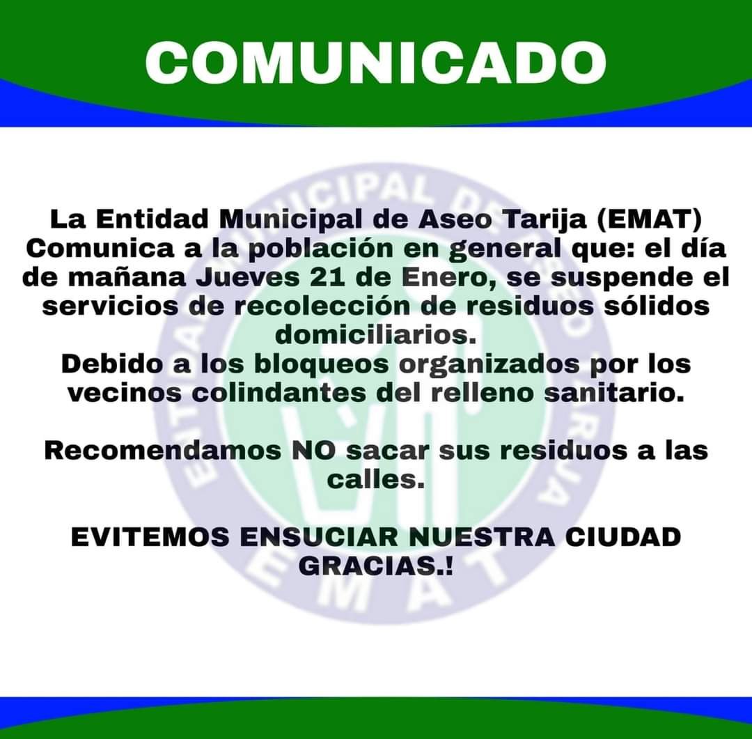 Debido a esto vecinos de los alrededores del botadero municipal de basura decidieron realizar un bloqueo del mismo a partir de las 00:00 del día de hoy, no dejaran pasar los camiones basureros hasta que las autoridades respondan. Por parte de la empresa recolectora de basura, EMAT (Entidad Municipal de Aseo Tarija), anunciaron que hoy no habrá recojo de basura.
