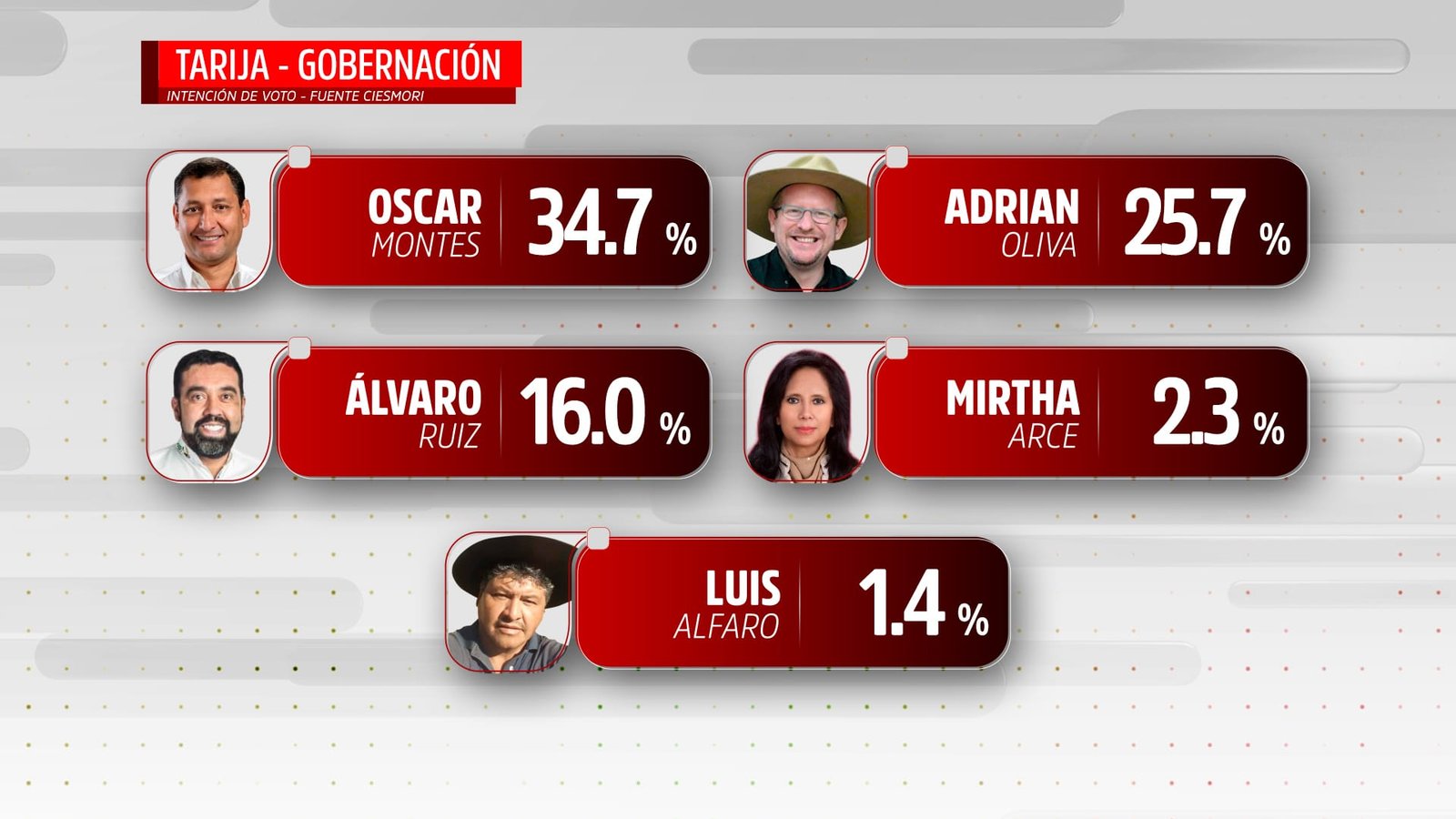 Son cinco las alternativas que tienen los votantes para elegir al nuevo gobernador de Tarija. En la encuesta de intención de voto, Oscar Montes lidera la preferencia. Si las elecciones fueran este domingo, obtendría el 34.7% de los votos, seguido de Adrián Oliva de Comunidad de Todos con el 25.7% según reportó Ciesmori.
