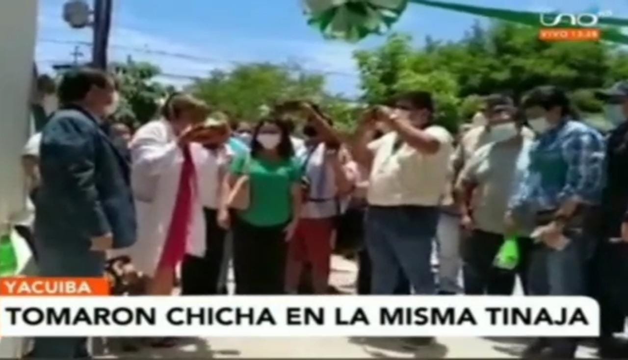 “Son autoridades que están en primera línea, ¿Ahora qué hacemos?, incluso está ahí la secretaria de salud de Yacuiba, donde se van hacer las pruebas de una enfermedad que se está tratando de evitar y se quitan del barbijo y comparten la misma bebida todos, y después que comparten se vuelven a poner el barbijo, e incluso se echan alcohol a las manos”, manifiesta el presentador de la Red Uno, tras el reporte de la noticia.