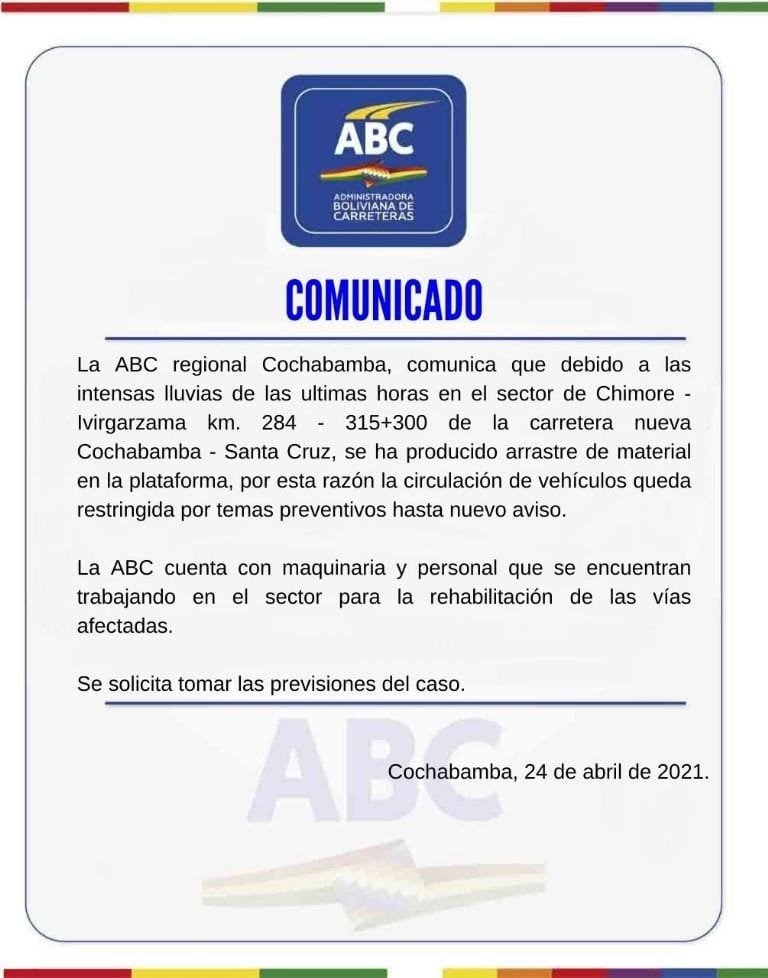 «Debido a las intensas lluvias en el sector de Chimoré-Ivirgarzama, kilómetro 284 de la carretera nueva Cochabamba-Santa Cruz, se ha producido arrastre de material en la plataforma, por esta razón la circulación de vehículos queda restringida por temas preventivos», comunicó la ABC, a través de sus redes sociales.