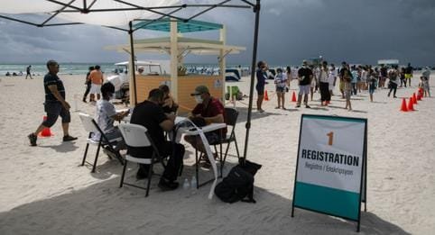 Decenas de turistas latinoamericanos se vacunaron este domingo en la playa de Miami Beach, en Florida, en un puesto que inmunizó