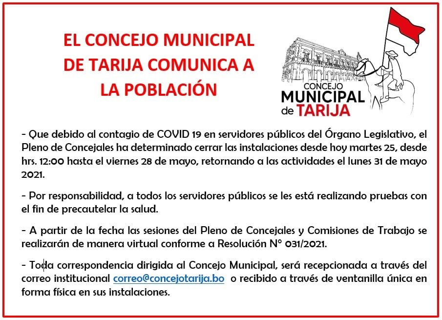 Gabriel Morales/El AndaluzEl Concejo Municipal de Tarija cerrará sus puertas a partir de la fecha, reanudando la atención regular recién el lunes de la próxima semana, a raíz de posibles contagios en las diferentes reparticiones de la institución.Mediante un comunicado oficial, el ente deliberante expresó que una ventanilla única permitirá la recepción de documentos en físico, mientras que existe la opción de enviar correspondencia al dominio electrónico de correo@concejotarija.com.Noticias de Tarija Navegación de entradasUn niño de un año da positivo a VIH en Tarija, hay 37 confirmados en el departamento Arce anuncia la llegada de un millón de vacunas Sinopharm en junio