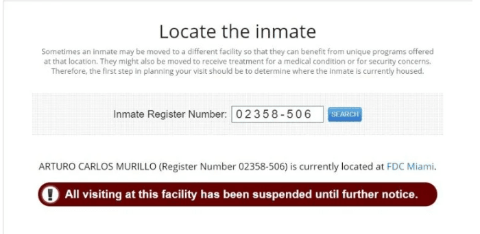 Arturo Carlos Murillo (Número de Registro Nº 02358-506), está actualmente en el Centro Federal de Detención de Miami (…). Todas las visitas a esta instalación han sido suspendidas hasta nuevo aviso”, indica.