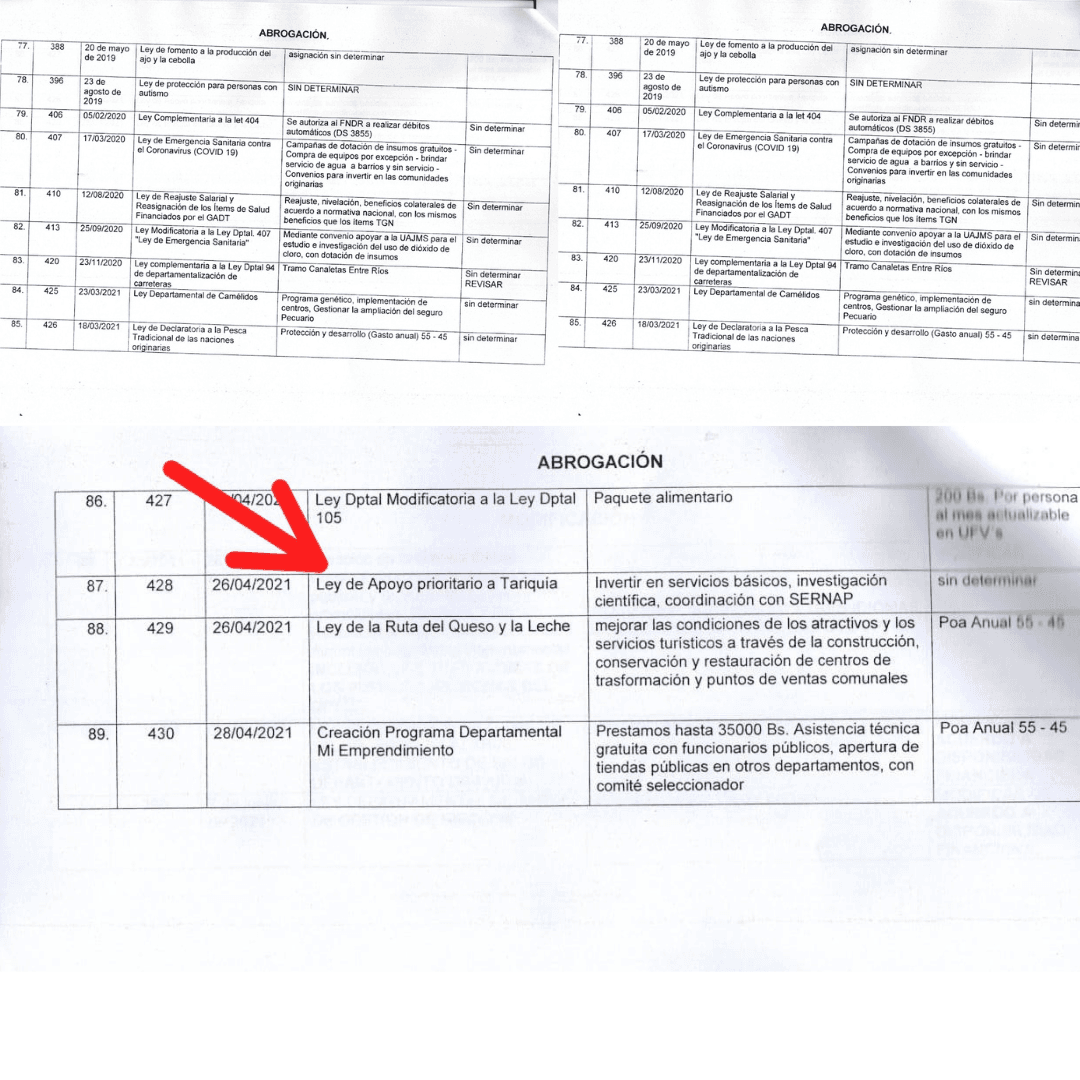 El asesor de presidencia de la comisión de constitución de la Asamblea Legislativa Departamental de Tarija (ALDT), Marco Cardozo Gemio, indicó a El Andaluz para las noticias de Tarija, que dentro del paquete de leyes (92) que se desea abrogar o modificar la Gobernación de Tarija a cabeza de Oscar Montes, estarían incluidas leyes sobre pago a personal de salud, y modificación salarial, como la ley departamental 104 y la ley 410.