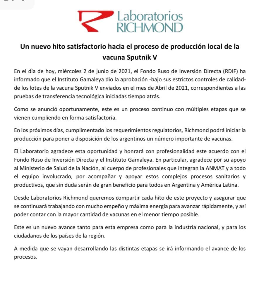 El laboratorio argentino Richmond anunció que en los próximos días podrá comenzar la fabricación masiva de la vacuna anticovid Sputnik