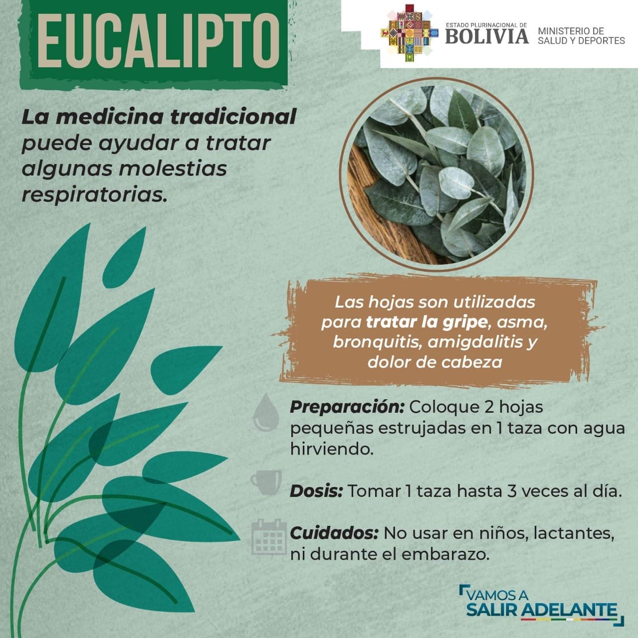 Por su parte la directora General de Medicina Tradicional, Maritza Patzi, explicó que no solamente la población debe buscar eucalipto o Wira wira, porque en Bolivia hay plantas con las mismas propiedades para fortalecer el sistema inmunológico y por eso dijo que desde el Ministerio de Salud y Deportes se trabaja para sensibilizar el uso de la medicina tradicional.