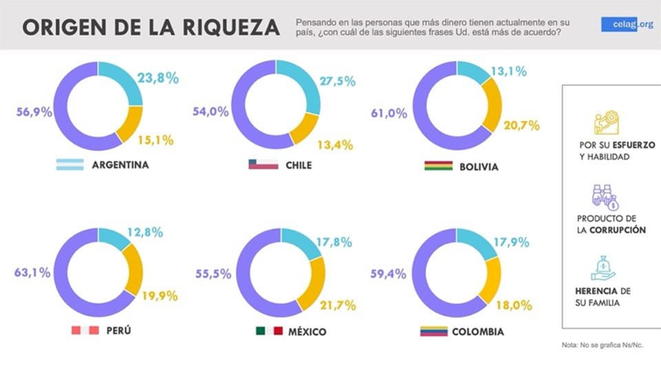 En el imaginario de la ciudadanía latinoamericana existe una gran mayoría que no «se come el cuento» de que los altos ingresos vienen originados por el esfuerzo. Hay un claro sentido común latinoamericano a este respecto. Por ejemplo, en Argentina, según nuestra encuesta CELAG, cuando se pregunta cuál es el origen de la riqueza de las familias más adineradas, sólo el 15,1 % considera que se debe al esfuerzo. El resto cree que es un asunto de corrupción o de herencia. En Chile, México, Bolivia, Perú y Colombia, los porcentajes son muy parecidos (13,4 %, 21,7 %, 20,7 %, 19,9 % y 18 %, respectivamente).