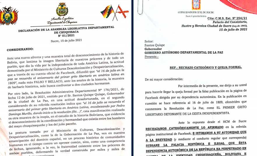 Autoridades legislativas de Chuquisaca y la ciudad de Sucre expresaron su molestia con publicaciones del Ministerio de Culturas y la