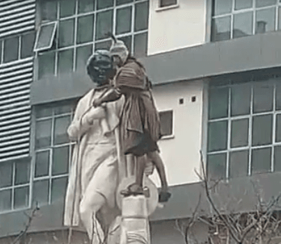 Un grupo indigenista de al menos 30 personas intentó tumbar este lunes la estatua de Cristóbal Colón en El Prado de