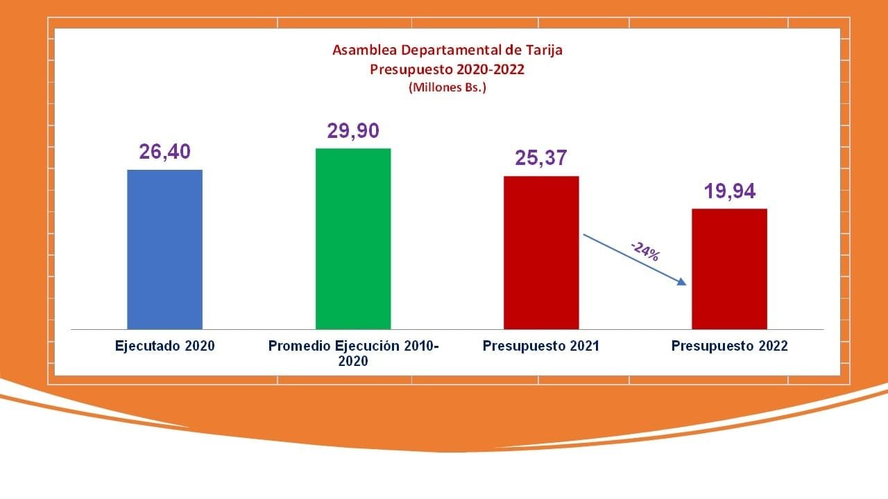 Osmar Arroyo/El andaluzEl vicepresidente de la Asamblea Legislativa Departamental de Tarija (ALDT), Mauricio Lea Plaza informó a El Andaluz que ayer se aprobó el presupuesto 2022 del ente legislativo.El legislador resaltó la reducción que se hizo en el presupuesto para el 2022.Para el próximo año se aprobó un presupuesto de 19. 94 millones de bolivianos, el presupuesto más bajo en la historia de la Asamblea Departamental.Lea Plaza mencionó para las Noticias de Tarija, que el 2020 se ejecutó un presupuesto de alrededor de 26 millones de bolivianos, para este año se presupuesto 25.37 millones de bolivianos y ahora para el próximo año los 19.94 millones de bolivianos, significan una reducción del 24 por ciento en el presupuesto de la Asamblea Departamental.“Es el presupuesto más bajo en toda la historia de la Asamblea Departamental”, remarcó.Señaló, que el ente legislativo de Tarija generalmente tuvo un presupuesto que estaba bordeando los 30 millones de bolivianos.Lea Plaza dijo que se hizo un esfuerzo muy importante por todas las bancadas de la Asamblea Departamental para aprobar un presupuesto con una reducción importante.Considera que esto se traduce en la política de austeridad que se implementa a nivel departamental.Se hicieron recortes en publicidad, en consultores en línea, se recortará la contratación de trabajadores eventuales, alquileres y también en combustible para los vehículos.Mencionó, que en el caso del combustible, se tomó la decisión de convertir todo el parque automotor de la Asamblea Departamental a Gas Natural Vehicular (GNV), con lo que reducirán los gastos de manera significativa.Considera que durante los meses que quedan de esta gestión se deberá hacer todos los esfuerzos para que a partir de enero del próximo año se pueda trabajar con un nuevo presupuesto bastante reducido. Navegación de entradasCuadrilátero: Edwin Rosas contra Maria Lourdes Vaca Empresa a cargo del tramo Isiri-La Central reiniciará trabajos en el proyecto después de más de tres años