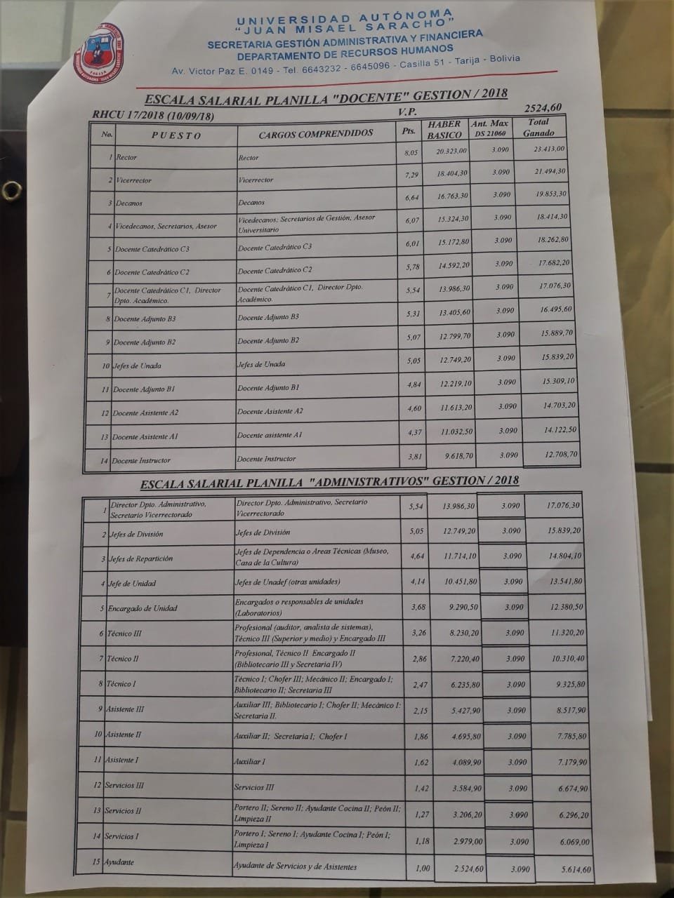 Es funcionaria administrativaUna nueva denuncia dentro de la Universidad Autónoma Juan Misael Saracho (UAJMS) sale a la luz pública y esta vez implica al ex vicerrector Ricardo Colpari, pues según un informe de una auditoría conocida a inicios de esta gestión, la hermana de la ex autoridad y hoy candidato a Rector habría sido promocionada dos niveles dentro de la casa universitaria en un mismo año, lo que hizo que se doblara su sueldo de 4.000 a 8.000 bolivianos en una gestión.El informe fue emitido por el departamento de Auditoría Interna en un documento complementario donde se da a conocer todos los datos liquidados en las planillas salariales y los registros individuales de cada servidor público de la superior casa de estudios. Ahí se da a conocer que Lidia Victoria Díaz, quien estaba como técnico I en el departamento de activos fijos pasó al nivel III, es decir que fue promocionada dos niveles en una misma gestión.Con la promoción Lidia Victoria Díaz, media hermana de Ricardo Colpari Díaz, quien ya era Vicerrector de la UAJMS, pasó de ganar más de Bs 4.000 en la gestión 2017, a tener un salario de 8.230 en la gestión 2018. Actualmente, con los incrementos salariales instruidos por el Gobierno, el salario de la funcionaria pasaría de los Bs 10.000.De acuerdo al reglamento de la Universidad, para lograr una promoción o un ascenso de grado esto se debe concretar de un nivel a otro por año y no saltar dos niveles o dos grados en una misma gestión. Pero además, para ser promocionado, es necesario contar con documentación de respaldo como cursos y otros que el trabajador haya realizado y le hagan merecedor de un ascenso.El universitario Diego Galeán lamentó que las autoridades universitarias hayan manejado de esta manera la universidad pensando en el beneficio de sus familiares y violando la normativa interna existente. Exigió a las actuales autoridades que se pueda aplicar lo que dice los reglamentos internos y sancionar a las personas que permitieron y promocionaron este tipo de situaciones.“No puede ser que el Vicerrector de nuestra superior casa de estudios de los tarijeños tenga a su media hermana trabajando en la universidad, eso no está permitido, pero por si esto fuera poco, le hizo doblar su salario en menos de un año y ahora resulta que ya no solo gana Bs 8 mil, sino que gana más de Bs 10 mil”, finalizó. Navegación de entradasJusticia de Chile emite condena contra un boliviano acusado de tráfico de migrantes Mancilla propone dividir a Tarija a tres regiones autónomas