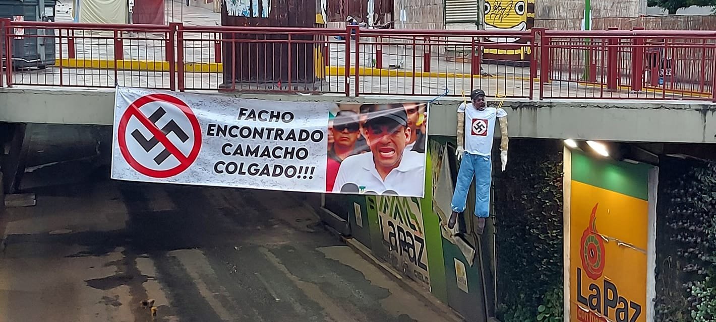 Muñecos colgados de puentes y pasarelas, y paredes pintarrajeadas aparecieron este miércoles en la ciudad de La Paz, a un día de que el gobernador de Santa Cruz, Luis Fernando Camacho, se traslade a la sede de Gobierno para presentarse a declarar ante la Fiscalía.La pasarela peatonal de la avenida Pérez Velasco, la salida del túnel de la avenida Villazón y hasta las puertas de la oficina del Ministerio Público fueron los espacios en los que se colocaron esas advertencias hacia el exlíder cívico cruceño.El miércoles, el ministro de Gobierno, Eduardo del Castillo, advirtió que existen grupos que quieren atentar contra la integridad de la autoridad regional. “Si fuera cualquier ciudadano que va prestar una declaración, ya sea un homicida, ya sea un asesino o ya sea una persona que confabuló para matar, le vamos a prestar todas las garantías”, dijo.Camacho debe apersonarse el jueves a las 09:00 ante la Fiscalía para declarar en calidad de denunciado, por la presunta comisión de los delitos de sedición, conspiración y terrorismo, dentro del caso del supuesto “golpe de Estado” de 2019.Asimismo, el presidente de la Cámara de Diputados, Freddy Mamani, pidió a la población de la ciudad de El Alto no movilizarse para evitar que el gobernador arribe a la sede de Gobierno.“Quiero decirles a los hermanos, que venga el señor a dar sus declaraciones, que venga a decir la verdad. Dejemos que el Órgano Judicial haga su trabajo y los señores convocados se presenten y digan su verdad. No necesitamos confrontación, que la justicia haga su trabajo”, señaló Mamani.En las últimas horas surgió un video en el que encapuchados amenazan a Camacho. “Solo queremos que llegues aquí, ya estamos armados y estamos organizados, te vas a llevar una sorpresa”, se escucha en el material audiovisual.Via El deber Navegación de entradasProcuran pena máxima para acusado de violación a una niña de tres años Comienza en Bolivia la devolución parcial o total de aportes a las AFP