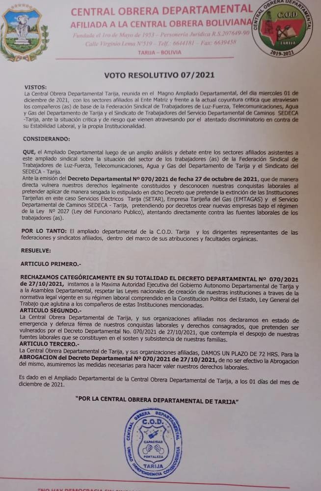 La Central Obrera Departamental de Tarija y sus organizaciones afiliadas nos declaramos en estado de emergencia y defensa férrea de nuestros conquistas laborales y derechos consagrados, que pretenden ser vulnerados por el Decreto Departamental 070/2021, que contempla el despojo de nuestras fuentes laborales que se constituyen en el sosten y subsistencia de nuestras familias.