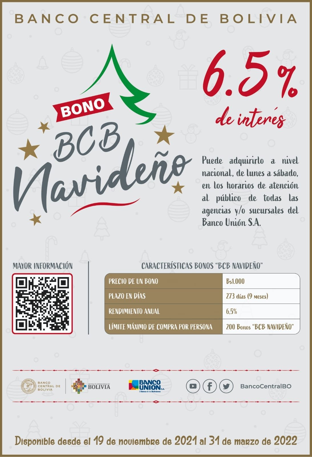 Reiteramos que el Bono “BCB Navideño” está dirigido exclusivamente a personas naturales. Tiene un valor de Bs1.000 (mil bolivianos) con un límite máximo de compra de 200 bonos por cliente, equivalente a Bs200.000 (doscientos mil