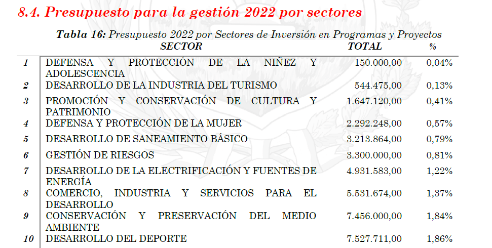 El Plan Operativo Anual (POA) 2022 muestras las prioridades de los gastos en Tarija, la Gestión de riesgos esta en lo más bajo junto con la adolescencia, la niñez, turismo, defensa hacia la mujer, desarrollo de saneamiento básico.