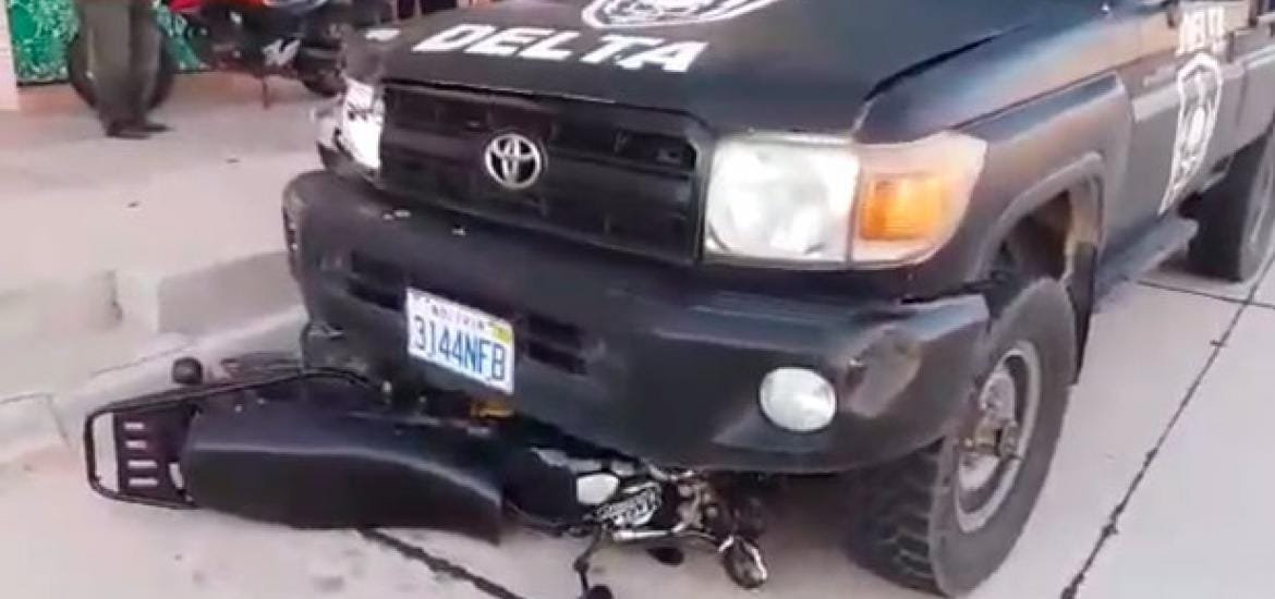 La avenida 2 de Agosto entre quinto y sexto anillo en la ciudad de Santa Cruz fue escenario de un accidente de tránsito protagonizado por una camioneta de la Policía. Los dos funcionarios de la institución policial que estaban a bordo del motorizado del grupo Delta fueron retenidos por los vecinos.“Gritamos todos porque pensamos que se llevaban una persona debajo, juntamente con la moto, pararon y dieron retro como queriendo soltar la moto”, explicó una vecina que presenció el accidente.La mujer señaló que como la motocicleta estaba siendo arrastrada se veía chispas en el suelo y mucha gente se acercó para ver si había alguna víctima. El motociclista resultó herido pero no fue arrollado por el motorizado.Según vecinos, los uniformados que se hallaban en la camioneta intentaron huir, pero fueron retenidos por transeúntes y vecinos. “No estaban borrachos pero eran muy jóvenes”, sostuvo una vecina. Navegación de entradasAprehenden al militar acusado de ayudar a fugar a su hijo presunto feminicida CEPB cuestiona pliego de alza salarial de la COB y advierte posible cierre de empresas