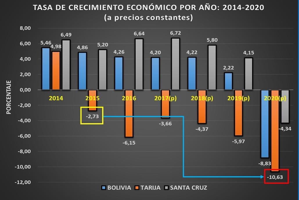 Tarija al fondo de BoliviaEl contrabando y la pobreza crecieron de manera alarmante, “es el único departamento de Bolivia, el único, que ha crecido en esos indicadores y eso es algo realmente preocupante” explicó el presidente del colegio de economistas.(Roberto A. Barriga/EL Andaluz)Tarija esta con los peores números económicos en el país, esto fue corroborado por el presidente del colegio de economistas, Fernando Romero, indicó que estamos en un decrecimiento, no generamos empresas, empleos, ni muchos menos ingresos, para eso elaboró siete puntos que muestran la crísis económica del departamento.El contrabando y la pobreza crecieron de manera alarmante, “es el único departamento de Bolivia, el único, que ha crecido en esos indicadores y eso es algo realmente preocupante” explicó y llamó a reflexionar y no buscar culpables sino soluciones.Romero expuso que el municipio y la Gobernación deben trabajar junto con todos los sectores y planear un desarrollo integral y sostenible.A partir del 2014 los hidrocarburos cayeron y tiene menos valor, y aún somos dependiente de ese sector, por lo que los ingresos cada vez son menos, “las autoridades no estuvieron a la altura” dijo y la inversión fue poca y los gastos muchos.Daniel Beccar, gerente de operaciones del Hotel los Ceibos, y expresidente de la Cámara Hotelera de Tarija, coincidió con Romero, y explicó que no existe reactivación económica. “Si reactivación económica es volver a los días gloriosos del gas, no hay reactivación. En Tarija se cierran mas empresa de las que se abren porque el riesgo y la inseguridad de tu inversión es muy alta. no hay condiciones. se deben crear oportunidades para salir de la pobreza” dijo.Cuando a Beccar se le consultó qué apoyo necesita el rubro y respondió que necesitan que el municipio y la Gobernación pongan de su parte porque no se nota el trbajo“No necesitamos apoyo, un ejemplo de eso es que venimos desarrollando nuestras actividades sin ningún apoyo de nadie. Lo que necesitamos es que ellos hagan su parte y cuál es su parte, por ejemplo, la copa (mirador)no tiene baños.Los restaurantes de la represa de san jacinto son inmundos, repugnantes, (palabras textuales de varios turistas con quienes interactuó en mi fuente de trabajo.Museo Paleontológico cerrado jueves de semana santa lo mismo la Casa Dorada, el Castillo Azul y el Museo Franciscano. el observatorio de Santa Ana a punto de cerrar, el centro colapsado con tanto tráfico, se debería hacer peatonales como en todas partes del mundo” dijo Beccar. A continuación, le dejamos los siete puntos que Fernando Romero resaltó y explican el problema de la crisis económica en Tarija.El PIB de Bolivia (a precios de mercado) durante el 2014-2020 ha crecido en un 11%, pero durante el 2019-2020, por la pandemia, cayó en un 11%, es decir todo lo que se construyó en años se derrumbó. En el caso de Santa Cruz, durante el 2014-2020, ha crecido en un 20%, pero decayó en 7% durante la pandemia, denotando una economía más diversificada y estable; caso contrario el de Tarija, durante el 2014-2020 tuvo un decrecimiento económico del 45%, durante la pandemia su contracción fue del 19%, sin dudas fue el departamento más afectado.Respecto a las tasas de crecimiento (a precios constantes), si comparamos de Bolivia, Santa Cruz y Tarija, durante el 2014-2019 tuvieron una reducción de 3,24, 2,34 y 10,94 puntos porcentuales. Siendo Tarija, el único departamento del país, desde el 2015 al 2020 que decreció en su economía; la pandemia la golpeo sin miramientos, ya que su decrecimiento paso de 5,97 a 10,63, cayendo en 4,66 puntos, es decir casi duplicamos nuestra recesión económica.La participación de nuestro PIB departamental en el contexto nacional ha caído de manera considerable, en 6,94 puntos porcentuales; es decir, estamos aportando al país alrededor del 50% menos de lo que hacíamos el 2014, lo cual está ligado directamente con la caída de los ingresos del sector hidrocarburífero tanto para Bolivia y sobre todo para Tarija. Caso contrario es el de Santa Cruz, que, en promedio, durante el 2014-2020 ha aportado al PIB de Bolivia alrededor del 30% de su valor.Si analizamos la participación de las actividades económicas en el PIB departamental, durante el 2014-2020, la “extracción de minas y canteras” cayo en 28,48 puntos porcentuales; en cambio los “servicios de la administración pública” subieron en 12,89 puntos, denotando la caída del principal sector económico de Tarija y el crecimiento de un aparato público estatal. Si vemos sus tasas de crecimiento, la “Extracción de Minas y Canteras” descendió en 63%, otro descenso importante fue en la construcción con un 33%; sin embargo, las actividades que ganaron espacio fueron “electricidad, luz y agua” con un crecimiento del 26%, “Agricultura, Silvicultura, Caza y Pesca” con 40% y “Servicios de la Administración Pública” por lejos el que más creció, con un 65% durante estos años.La muestra más clara que nuestro aparato productivo y que nuestra economía está casi “nada” diversificada, son sus exportaciones; del 100% de exportaciones departamentales, en promedio, durante el 2014-2020, el 97% fue gas natural. Además, los ingresos por la venta de este hidrocarburo al exterior cayeron en un 73%. En cambio, para Santa Cruz, como referencia, durante el mismo periodo el gas natural, en promedio, represento apenas un 37% de sus exportaciones; lo cual refleja una economía mucho más diversificada, fuera de la producción y venta de “productos tradicionales”.Durante el 2014-2020, nuestra población creció en un 11%, sin embargo, nuestro PIB departamental y PIB per cápita descendieron en un 45% y 51% respectivamente; esto denota un bajo crecimiento demográfico, que, sumando al decrecimiento económico de Tarija, sin dudas demuestra nuestra situación compleja comparada con el contexto nacional.La pobreza en Bolivi