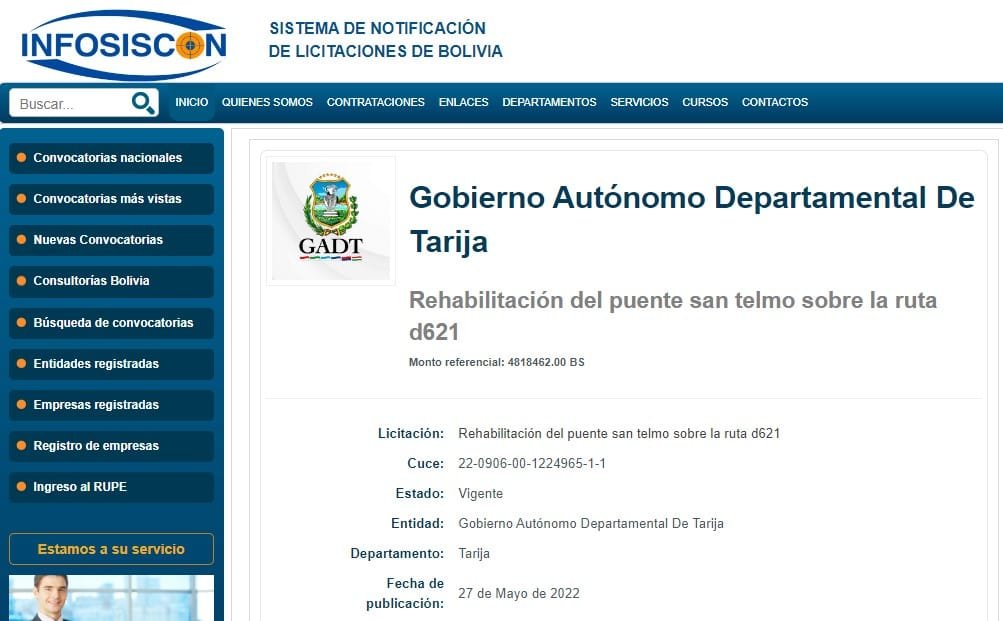 Osmar Arroyo/El AndaluzEl pasado viernes el Gobierno Autónomo Departamental de Tarija (GADT) subió al Sistema de Contrataciones Estatales (Sicoes) la licitación para la rehabilitación del puente San Telmo.El 2020 las caudalosas aguas del río, debido a las lluvias se llevó la plataforma del puente.Ahora la Gobernación inicio con el proceso de licitación para que las empresas puedan presentar sus propuestas para la rehabilitación del puente y no se tengan problemas en el tráfico vehicular durante la época de lluvias en la ruta Bermejo-San Antonio.El presidente del Comité Cívico de Bermejo, Víctor Sánchez indicó que es importante que se licite lo antes posible la obra para que no se tengan problemas en verano.De acuerdo a la información en la página de notificaciones de licitación, la presentación de propuestas es hasta el 20 de junio del presente año.Se estima un presupuesto para la rehabilitación del puente de 4818462,00 bolivianos.Además de la licitación, la Gobernación se comprometió en concluir con el tramo que falta asfaltar en la carretera Bermejo-San Antonio.Las instituciones de Bermejo hacen seguimiento al tema para que se pueda cumplir con los compromisos realizados. Navegación de entradasAceleran creación del SATT para remplazar a la DOT que continúa sumando hechos de corrupción Cívicos piden a YPFB llevar gas a Bermejo de Campo Durán para cubrir demanda interna