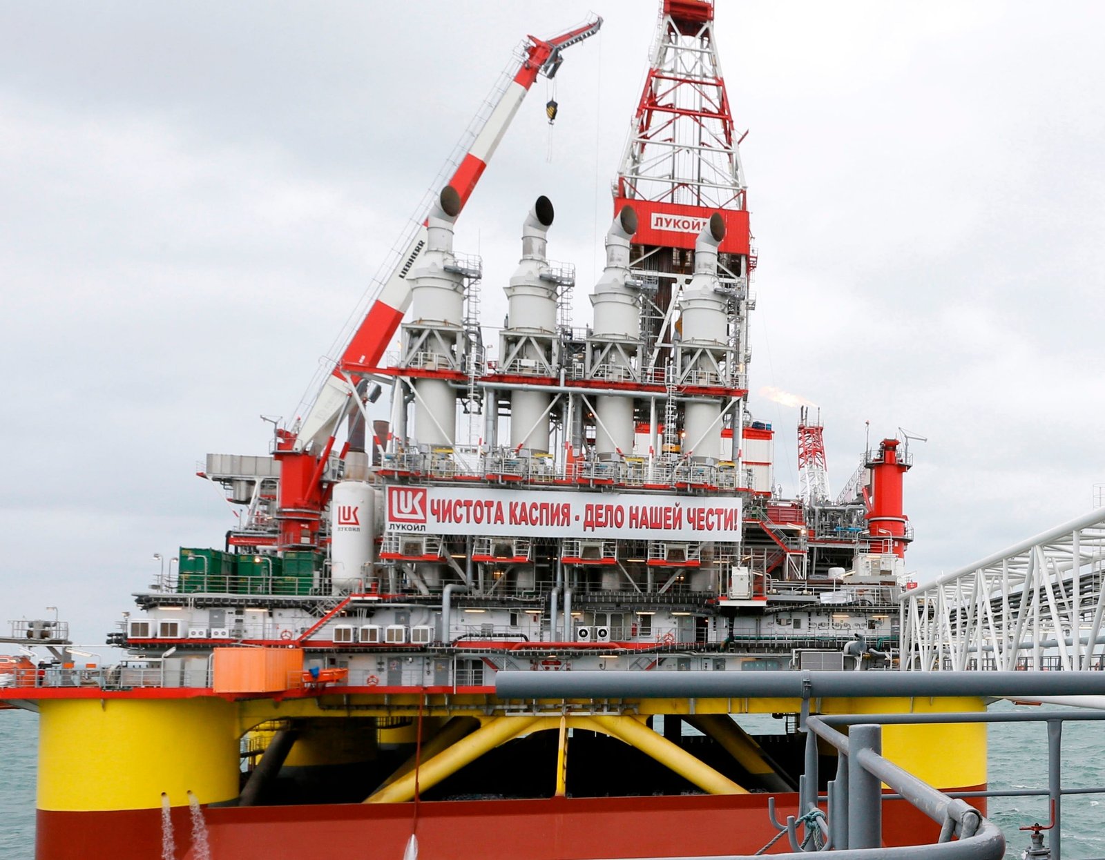 ALTERNATIVE CROP A Lukoil oil platform is in the Caspian Sea, about about 1280 kilometers (800 miles) south of Moscow, Russia, Wednesday, Oct. 2, 2013. The sign in the background reads "Lukoil: The clean Caspian is a matter of honor for us." Russian Prime Minister Dmitry Medvedev visited the platform on Wednesday. (AP Photo/RIA-Novosti, Dmitry Astakhov, Government Press Service)