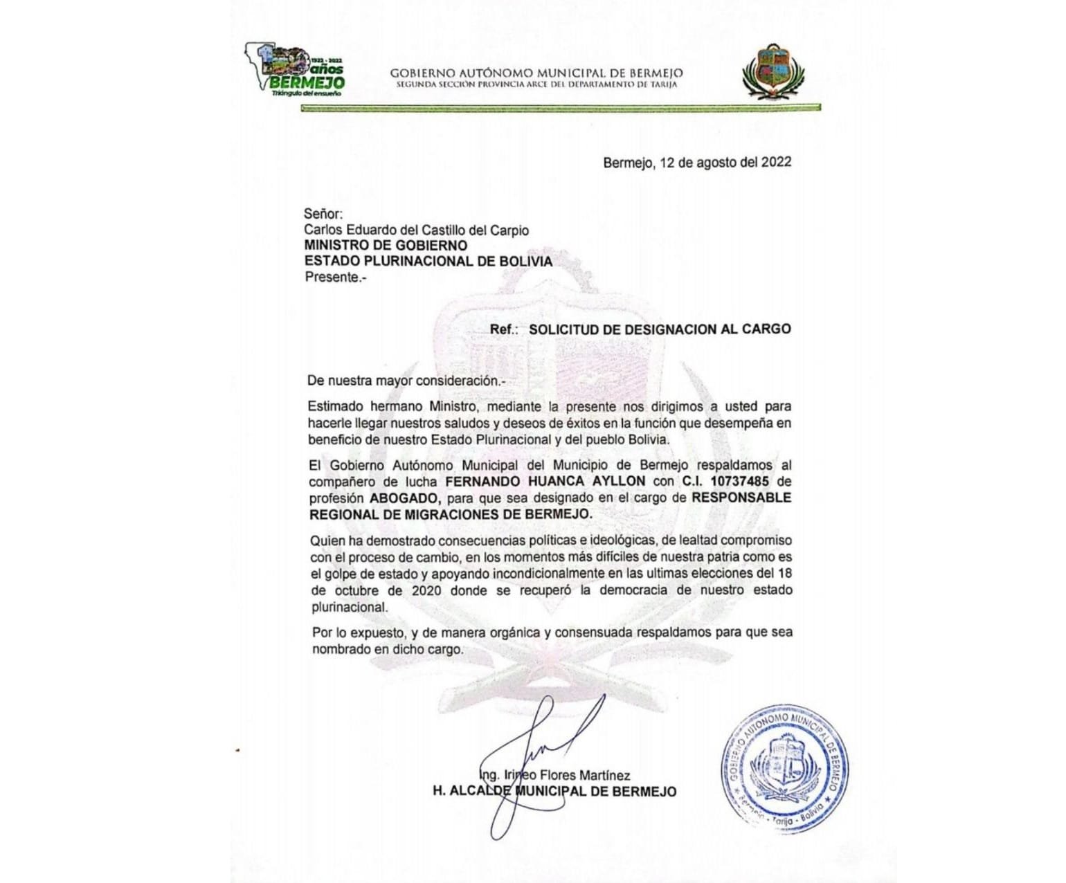 El Andaluz/BermejoEl concejo municipal de Bermejo pidió informe al ejecutivo municipal Irineo Flores, como así también a la concejal municipal Abigail Cruz, ambos del Movimiento al Socialismo (MAS) sobre los avales políticos que abrían firmado éstas dos autoridades para solicitar la designación de un nuevo responsable de migraciones regional Bermejo, a decir de Daniel Condori, presidente del ente deliberante, actualmente no tienen ninguna información ni denuncia oficial de dichos documentos que están siendo cuestionados, puesto que se habría utilizado, por parte del alcalde, papel membretado de la alcaldía y firmado como alcalde de Bermejo, en relación a la concejal habría firmado como concejal municipal.Condori reconoció que dichas acciones, de ser reales serán enviadas a la comisión de ética, puesto que estarían tipificadas como delitos como tráfico de influencias, en ese entendido están esperando dichos informes para ser tratados en el seno del concejo y ver que determinan la mayoría de los miembros del concejo municipal.Por su parte, Never Vega, también concejal por el MAS, se limitó a indicar que esos temas lo tienen que tratar en sesión del concejo, pero que los avales políticos siempre existieron, lamentablemente se manejaron de manera equivocada puesto que éstos deberían salir de una organización social o dirigentes políticos y no de autoridades políticas.Mirian Calisaya, quién es la concejal de la minoría reprobó el accionar al indicar que ellos fueron elegidos para trabajar por la población y no para andar de avaladores, lo cual demuestra que se están ocupando de otras situaciones y no de los que les encomendó la ciudadanía que emitió su voto democrático.“Es una vergüenza que se manejen de esa manera, encima de todo ni siquiera a profesionales bermejeños abalan ellos, debería ser primero a los bermejeños, pero resulta que es un profesional de Tarija y eso está muy mal”, cuestionó Calisaya. Navegación de entradasEmpresa de agua no está en condiciones de administrar nuevo proyecto de aducción Argentina ya no exige carnet de vacunación a bolivianos que quieran cruzar la frontera