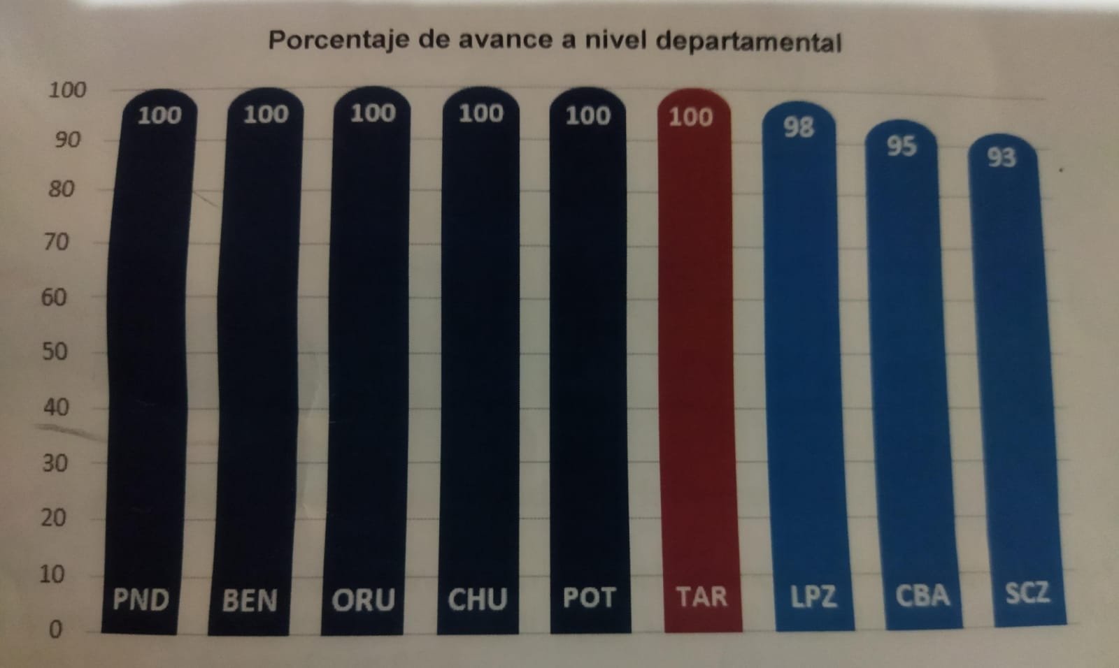 Con respecto a las estadísticas nacionales, 6 departamentos cuentan con la cartografía al 100%; Pando, Beni, Oruro, Chuquisaca, Potosí y Tarija, mientras que el Departamento de La Paz presenta un avance del 98%, Cochabamba un 95% y en último lugar Santa Cruz con el 93%.