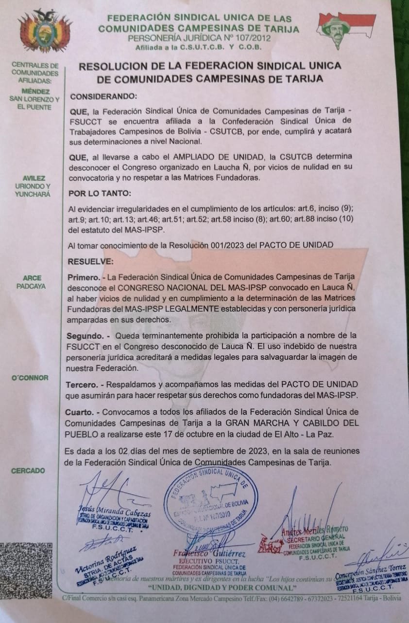 Por Rosy Sánchez/El AndaluzLa Federación de Campesinos de Tarija emitió este lunes un voto resolutivo de desconocimiento al Congreso del MAS-IPSP en Lauca Ñ y señala que existe vicios de nulidad al restringir la participación de las organizaciones matrices fundadoras.Como artículo segundo la resolución señala: “Queda terminante prohibida la participación a nombre de nuestra Federación Sindical Única de Comunidades Campesinas de Tarija en el congreso desconocido de Lauca Ñ”.Durante la lectura, el Secretario General, Andrés Meriles dijo que “respaldan todas las medidas tomadas por el Pacto de Unidad que se asumirán para hacer respetar sus derechos como fundadores del MAS-IPSP, así mismo se convoca a la gran marcha y cabildo a desarrollarse en la ciudad de El Alto el próximo 17 de octubre. Navegación de entradasIntendencia decomisó 179 productos vencidos en una perfumería del centro de la ciudad Exposur 2023: Gobernación cierra acuerdos para el lanzamiento oficial de la cartelera artística