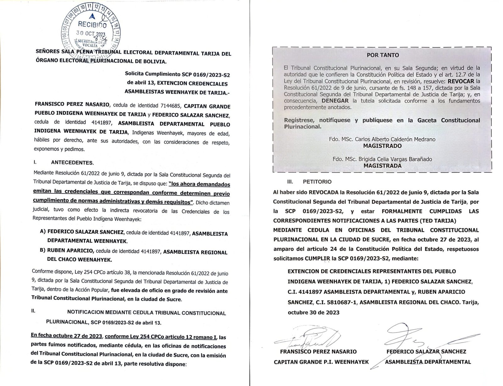 Osmar Arroyo/El AndaluzEl presidente de la Organización de Capitanías Weenhayek de Tarija (Orcaweta), Francisco Pérez y Federico Salazar presentaron una nota ante el Tribunal Electoral Departamental (TED), para solicitar que se haga la entrega de credenciales a los asambleístas que representan al pueblo indígena.En junio del año pasado tras una resolución de la Sala Constitucional Segunda del Tribunal Departamental de Justicia de Tarija sobre una acción popular, se retiró las credenciales a asambleístas titulares y suplentes, departamentales y regionales que representaban al pueblo Weenhayek y se entregó credenciales a nuevos representantes del pueblo indígena.En abril del presente año, mediante sentencia constitucional del Tribunal Constitucional Plurinacional TCP, se revocó la resolución del año pasado.Ante esa situación solicitan que se emita por el órgano electoral las credenciales para los asambleístas por el pueblo Weenhayek, para que sean restituidos en sus curules.Entre los asambleístas, que esperan la emisión de credenciales esta Federico Salazar, a quién le retiraron la credencial cuando fungía como presidente de la Asamblea Legislativa Departamental de Tarija.Piden al órgano electoral que cumpla con la sentencia constitucional que revoca la resolución de junio del año pasado. Navegación de entradasAlcalde de Tarija es nombrado vicepresidente internacional del Instituto de mejores Gobernantes 2023 Crédito para estudio del tramo Pajchani-El Portillo-Cruce el Valle aún no se aprueba en detalle