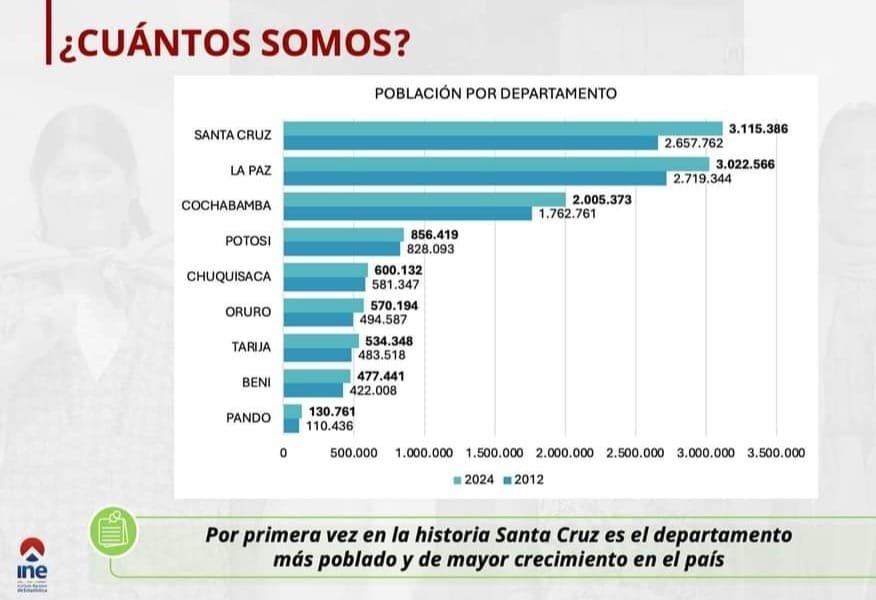 Según los datos oficiales del INE, Bolivia cuenta con una población total de 11.312.620 habitantes. Tarija, con 534.348 habitantes, se posiciona como el séptimo departamento más poblado del país, superando a Beni y Pando. Sin embargo, esta cifra ha generado una fuerte controversia en el departamento, dado que representa un crecimiento muy por debajo de las expectativas locales.