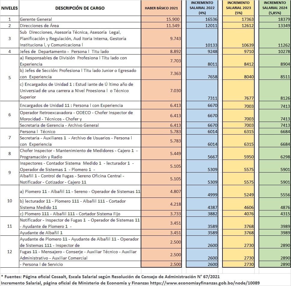“Estos niveles salariales es a base de una resolución 067 establecido en la anterior gestión del concejo de administración, sin contar bonos de transporte de antigüedad, transporte, bonos de te y otros veneficios que no condicen con la realidad económica de COSAALT”, dijo Rodríguez.