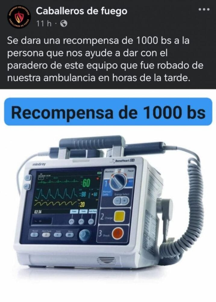 El pasado martes en horas de la tarde un equipo desfibrilador monitor que permite la reanimación de pacientes fue sustraído del interior de la ambulancia tras ser forzada la puerta del vehículo. Este equipo tiene un costo superior a los 5.000 dólares.