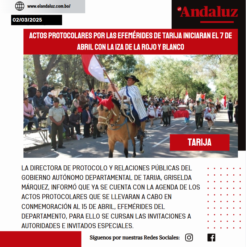 La directora de Protocolo y Relaciones Públicas del Gobierno Autónomo Departamental de Tarija, Griselda Márquez, informó que ya se cuenta con la agenda de los actos protocolares que se llevaran a cabo en conmemoración al 15 de Abril, efemérides del departamento, para ello se cursan las invitaciones a autoridades e invitados especiales.