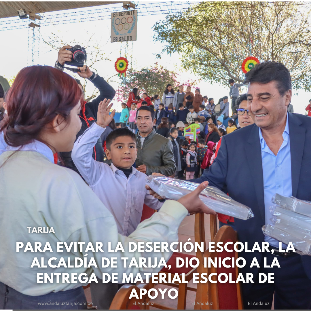 Agencias/El AndaluzAnte la crisis económica y para evitar la deserción escolar, la Alcaldía de Tarija, dio inicio a la entrega de material escolar de apoyo. Mediante un acto protocolar realizado en la Unidad Educativa Hermann Gmeiner, el alcalde, Johnny Torres Terzo, informó que dicho material de apoyo llegará a los 55 mil estudiantes de la provincia Cercado desde el nivel inicial hasta el nivel secundario.“Muy felices porque nosotros como Alcaldía cumplimos, con la entrega de este material de apoyo lo que buscamos es frenar la deserción escolar, buscamos que los niños y jóvenes sigan estudiando porque es la única manera de vencer la pobreza y tener un mejor futuro, nuestro compromiso con la educación está cumplido, con la alimentación complementaria, con el transporte escolar en el área rural y ahora con este material escolar de apoyo, ahora les pedimos a los jóvenes y niños que cumplan con el compromiso para que sigan estudiando”, dijo Torres Terzo.Durante la entrega en la mencionada Unidad Educativa, se pudo observar que cada estudiante recibió un cuaderno tamaño oficio, tres lapiceras, dos lápices, 12 marcadores entre otros insumos que forman cada kid, que está valorado en 61 bolivianos. En ese sentido la máxima autoridad municipal afirmó que se realizarán las entregas del material escolar en las 190 unidades educativas de la provincia Cercado.“Siempre lo digo, si como Alcalde me dieran solo un pesito, un boliviano de presupuesto y me preguntaran en que lo invertiría ese pesito, ese boliviano, mi respuesta sin duda seria lo invertiría en educación. En este tiempo de crisis esperamos que sirva de apoyo para los jóvenes y niños, porque nosotros hacemos análisis al inicio del año escolar y al finalizar las vacaciones, para identificar posibles casos de deserción escolar y los motivos”, declaró Torres Terzo.Por su parte tanto los padres de familia, profesores y los mismos estudiantes reconocieron destacaron y calificaron como algo histórico, ya que es la primera vez en Bolivia que una Alcaldía entregue material escolar. Es así que la directora de la UE Hermann Gmeiner, Nancy Ruiz Aban, aseveró que por la crisis económica que día a día se agudiza, muchas veces algunos materiales que requieren los jóvenes y niños son inaccesibles por el precio elevado en el que se encuentran actualmente.“Muchas autoridades pasaron por los cargos del municipio y muy pocas le prestaron atención a la educación, es por eso que hoy nos sentimos contentos, le agradecemos al alcalde, Johnny Torres Terzo, por esta entrega que se hace por primera vez, por primera vez se hace la entrega de material escolar en beneficio de los estudiantes, porque más en este tiempo de crisis es una gran ayuda, en la unidad educativa Hermann Gmeiner tenemos mil ciento cuarenta estudiantes”, explicó Ruiz Aban.Finalmente también se entregaron botiquines de primeros auxilios, los cuales también serán distribuidos en los 190 establecimientos educativos. Navegación de entradasGobernación fortalece el Materno Infantil con equipamiento gestionado ante el gobierno de Turquía Se suman nuevos casos a las denuncias de presuntas irregularidades en Derechos Reales
