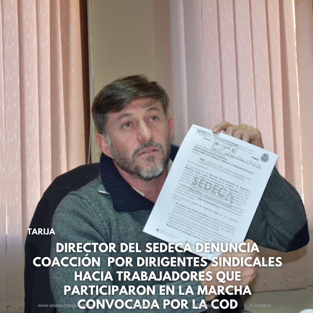 Agencias/El AndaluzEl director del Servicio Departamental de Caminos (SEDECA), Marcos Bass Werner Fortunati, denunció públicamente la supuesta coacción ejercida por dirigentes sindicales hacia trabajadores que participaron en la marcha convocada por la Central Obrera Departamental de Tarija (COD), señalando que, muchos de ellos habrían sido obligados a asistir bajo amenaza de sanciones.Bass Werner explicó que ya puso en conocimiento de la Dirección Departamental del Ministerio de Trabajo esta situación y solicitó, con carácter urgente, la presencia de un inspector para verificar posibles ausencias ilegales a la función pública. “Hay muchos trabajadores que están marchando obligados. El propio comunicado del sindicato indica que se realizará un control estricto de asistencia y se sancionará a los inasistentes. Así operan estas mafias sindicales”, afirmó.Según el director, varios de los empleados afectados perciben sueldos mínimos y no pueden arriesgarse a descuentos salariales, por lo que ceden a la presión de participar en medidas de protesta ajenas a sus funciones.Bass Werner manifestó su preocupación por la falta de acción inmediata del Ministerio de Trabajo: “Si actúan con rapidez cuando un trabajador presenta una denuncia, también deberían hacerlo cuando una institución alerta sobre un incumplimiento laboral. De no hacerlo, podría interpretarse como parcialización, y eso sería inadmisible”.El director aseguró que este tipo de acciones sindicales generan abandono de funciones y afectan directamente a la población. “Después se molestan cuando la ciudadanía les reclama que no trabajan. Este es un ejemplo claro de cómo se perjudica al país y de por qué necesitamos un cambio urgente en la forma de manejar las relaciones laborales”, concluyó.El vocero del Gobierno Autónomo Departamental de Tarija, Andrés Castellanos, cuestionó la movilización convocada por la Central Obrera Departamental (COD), calificándola como una acción política impulsada por sectores afines al Movimiento al Socialismo (MAS) en contra de la Gobernación.Castellanos afirmó que la COD “forma parte del actual Gobierno Nacional, el mismo que llevó al país a la peor crisis económica de las últimas décadas”. Señaló que algunos dirigentes “utilizan a las bases y argumentos sociales para mantener privilegios y atacar políticamente” al gobierno departamental.En relación a las demandas del sector salud, explicó que la contratación de personal y la gestión de los centros de primer y segundo nivel es competencia de los gobiernos municipales, según la Constitución Política del Estado, la Ley Marco de Autonomías y las normativas nacionales. “No podemos seguir asumiendo responsabilidades que no corresponden al Gobierno Departamental”, subrayó.Respecto al bono de vacunación, indicó que el costo asciende a ocho millones de bolivianos, recursos con los que la Gobernación ya no cuenta. “Si destinamos esos fondos al bono, tendríamos que quitarlos de programas esenciales para adultos mayores, niños y huérfanos”, advirtió. Además, recordó que más del 80% de los trabajadores que exigen el pago no son funcionarios del gobierno departamental, sino que dependen del Ministerio de Salud y deberían reclamar el beneficio a su empleador.Castellanos hizo un llamado al sector salud para que priorice la atención a los pacientes: “La salud no puede parar un día, es un derecho fundamental de todos los tarijeños y bolivianos”.Finalmente, cuestionó la participación de la COD en las protestas: “Ellos son responsables de la crisis actual y deberían gestionar ante el Ministerio de Salud la asignación de recursos para cubrir las demandas sociales del sector, en lugar de promover movilizaciones políticas”. Navegación de entradasAlcaldía inicia la entrega de material escolar de apoyo en el área rural Richard López: Del trabajo popular al parlamento con el respaldo de la población como el “Candidato del Pueblo”